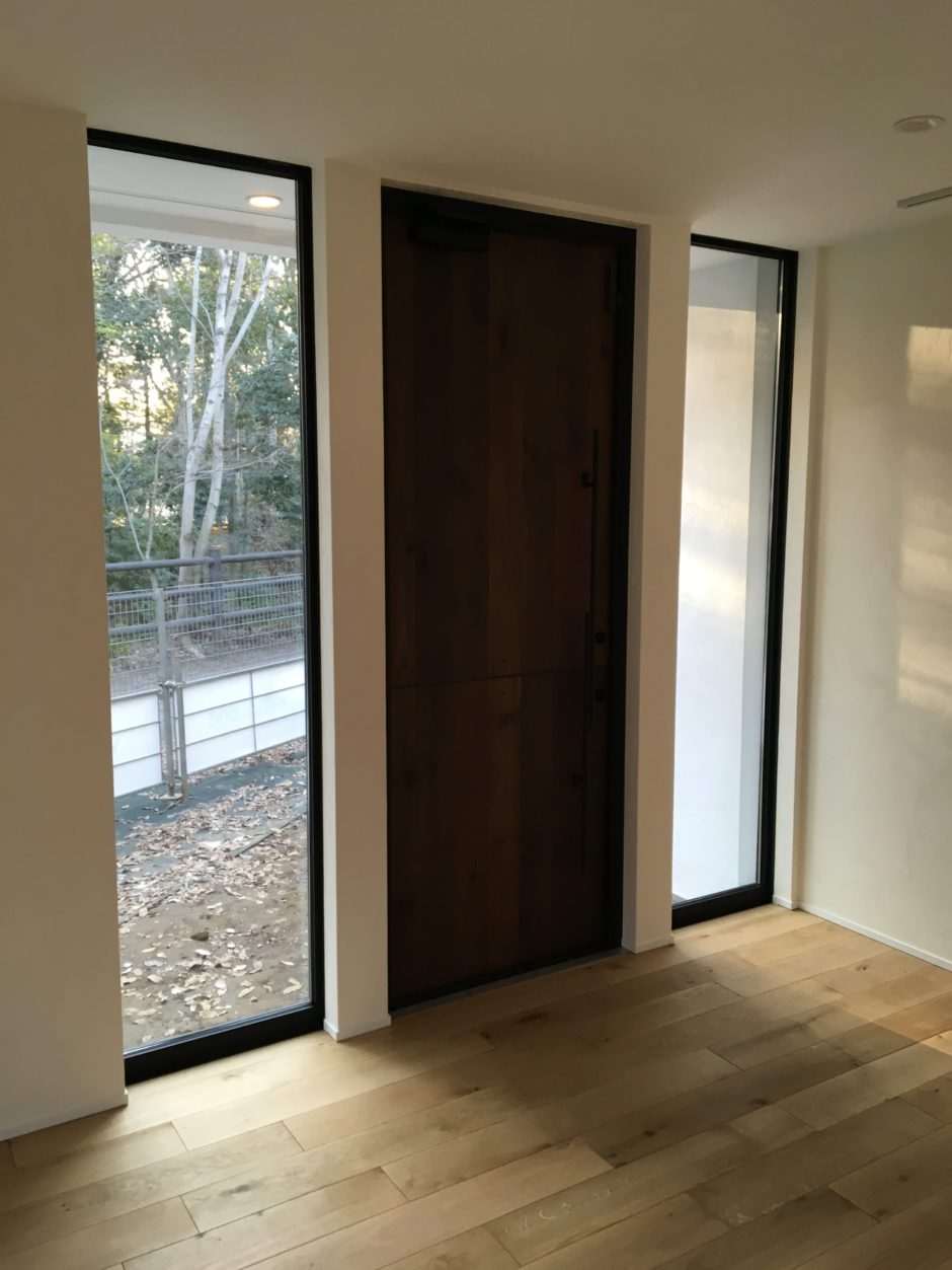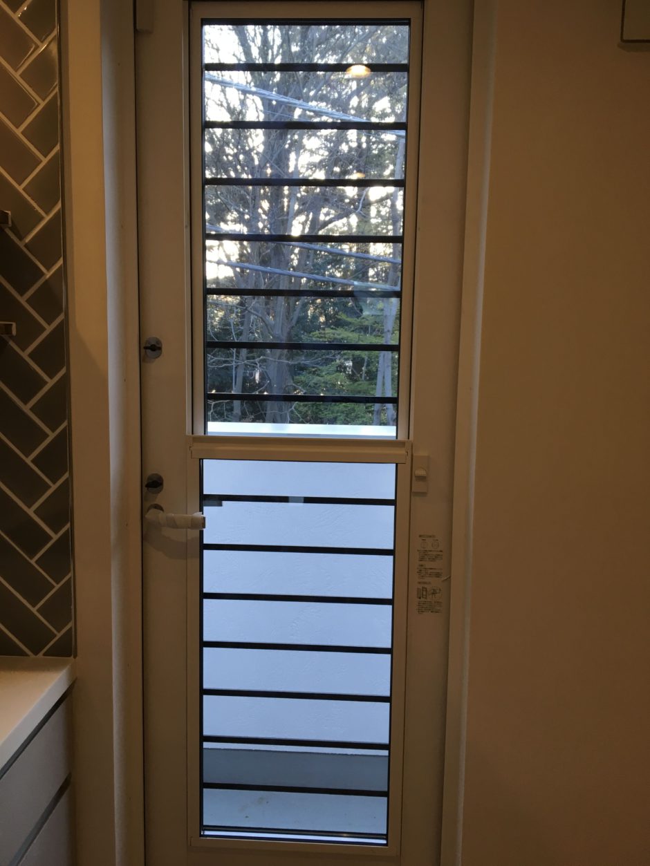 ‍施工後。玄関の鍵を厳重にしても、サイドにある小窓から空き巣に侵入されてしまっては意味がありませんので、玄関脇の窓には防犯フィルムを貼ることを強くお勧めします。