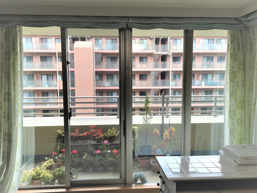 ‍マンションの居室の窓に防犯フィルムを貼り付け。