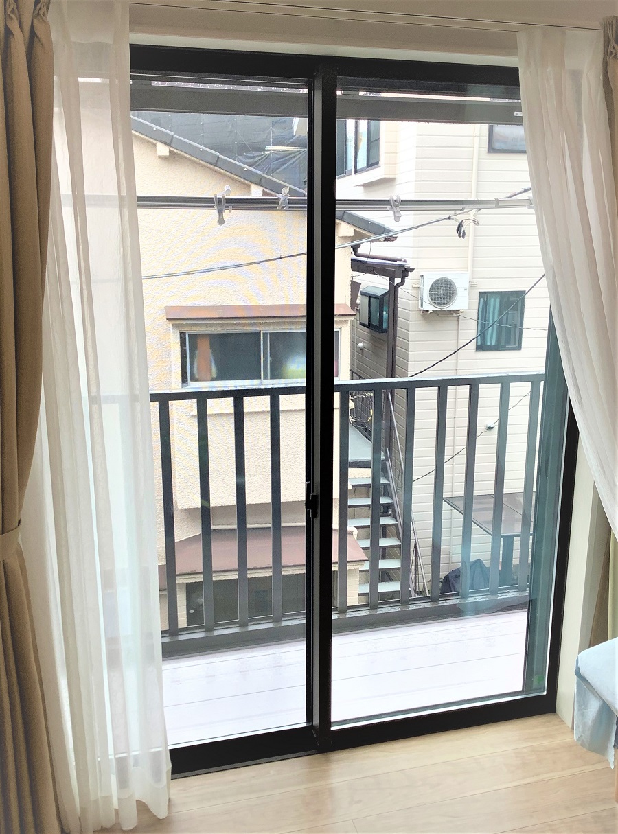 ‍住居の2階窓に防犯フィルムを貼り付け。