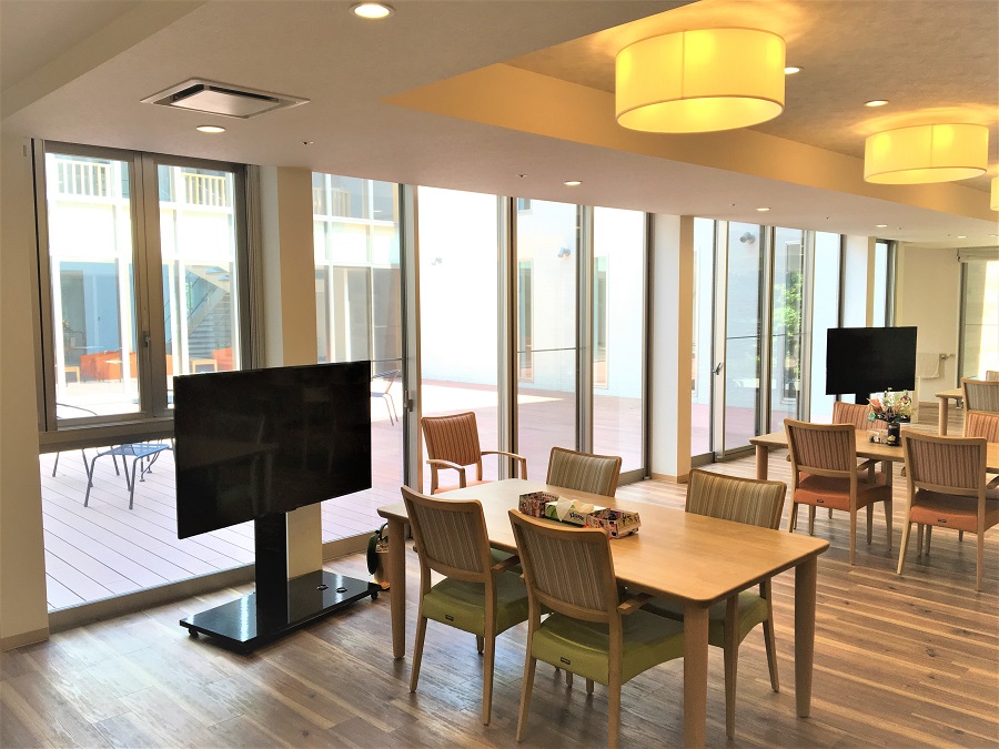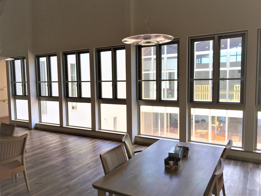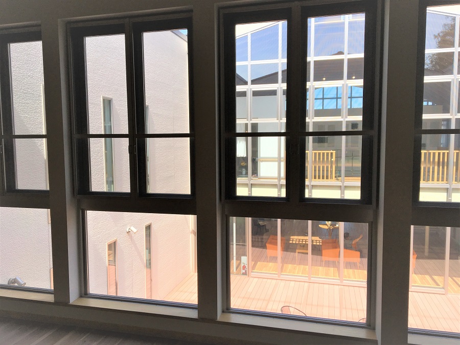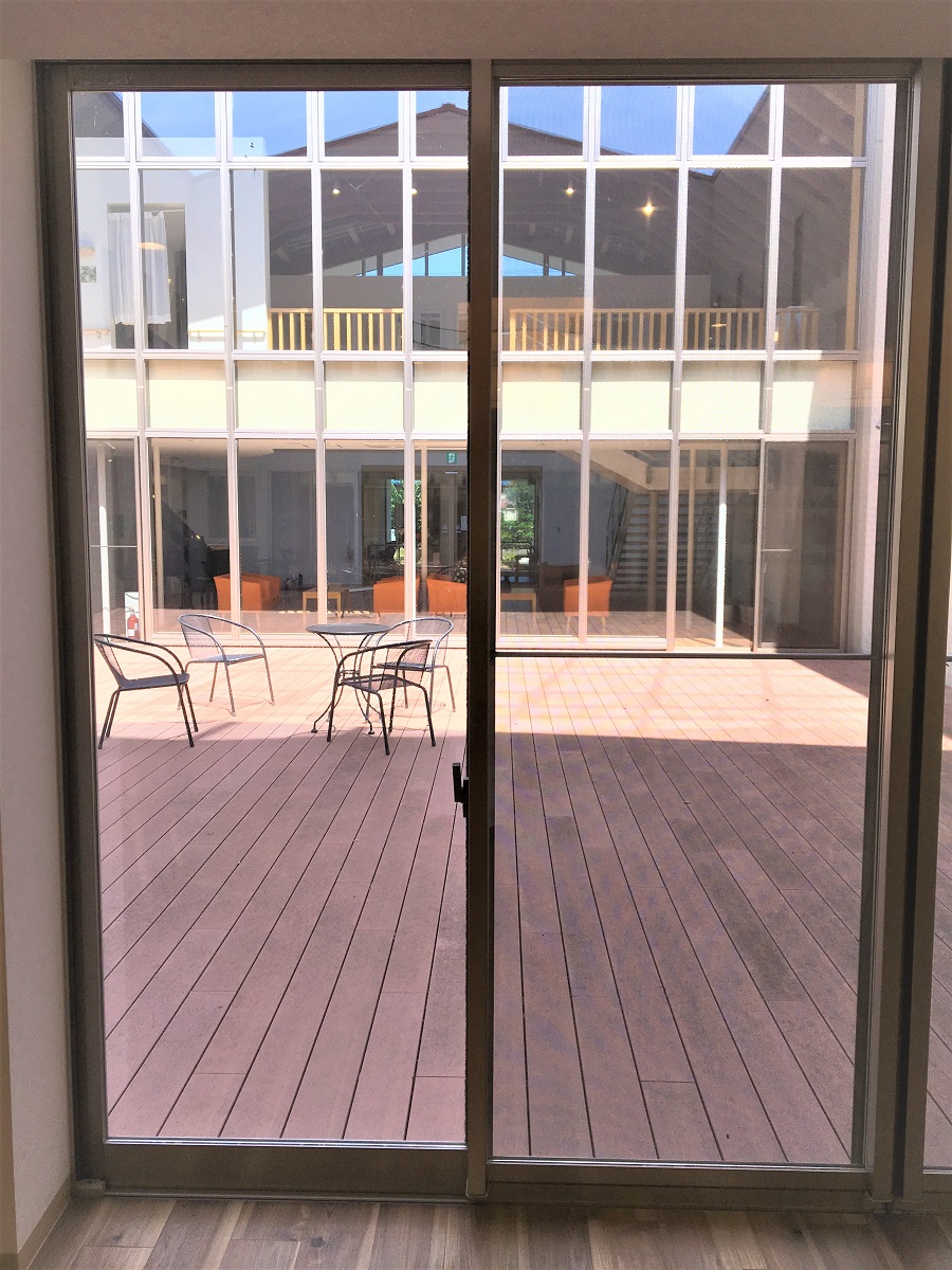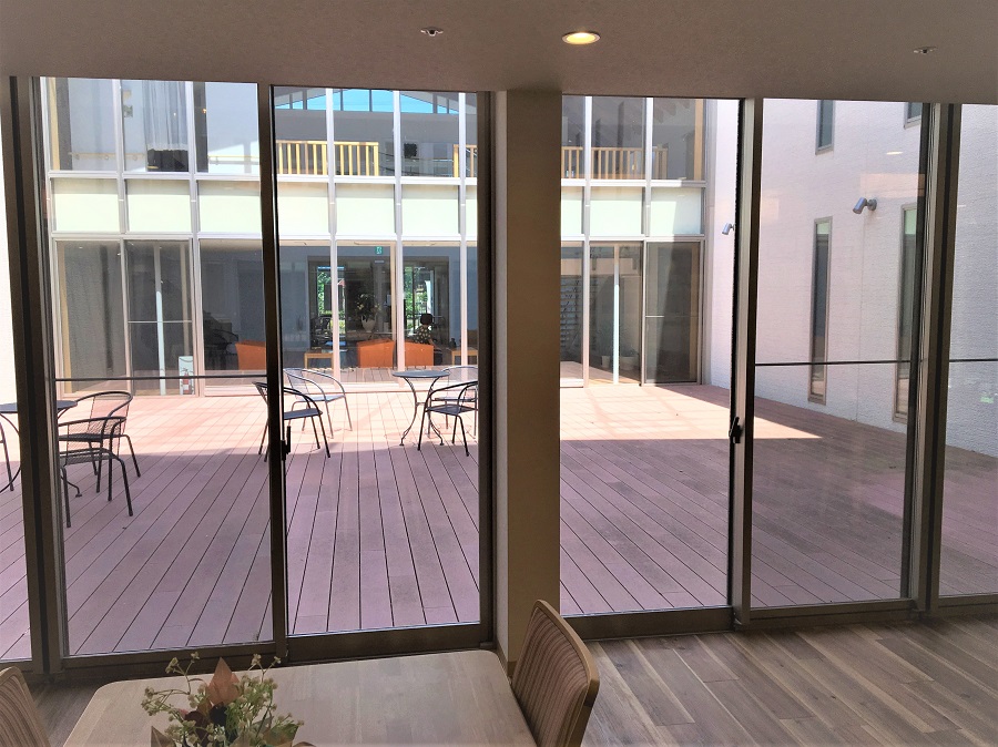 ‍施設内のパティオに面した窓に断熱フィルムを貼り付け。