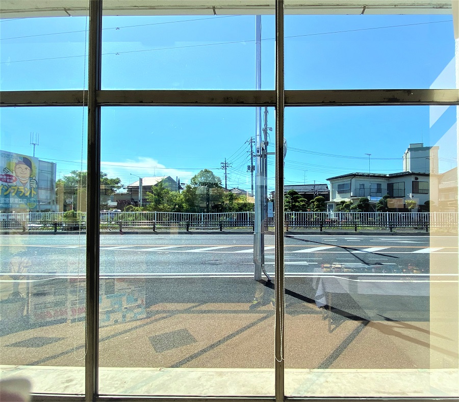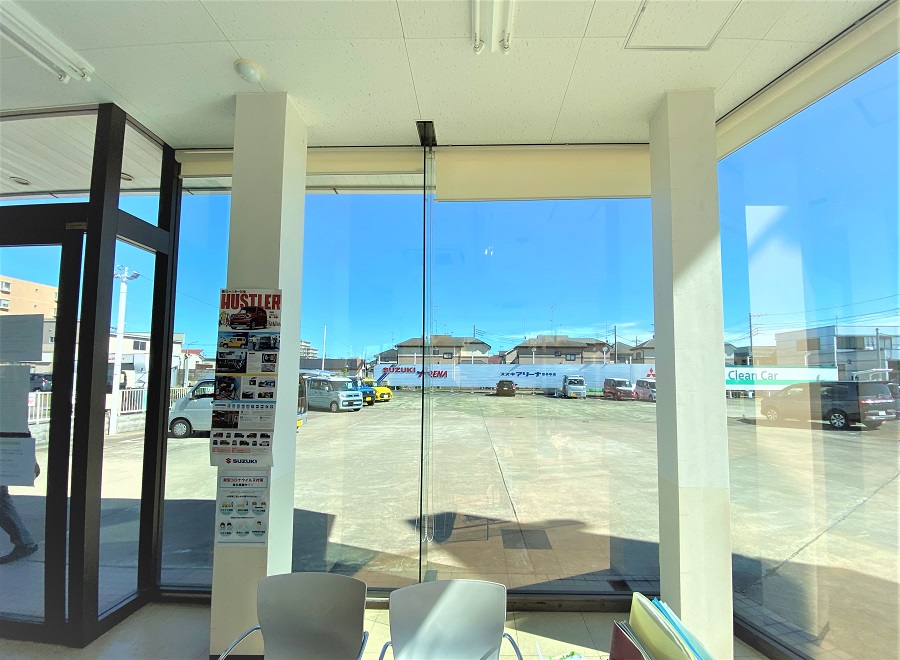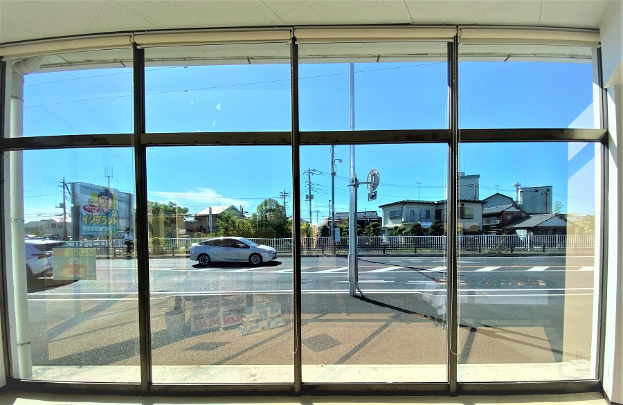 ‍ショールームの窓前面に断熱フィルムを貼り付け。