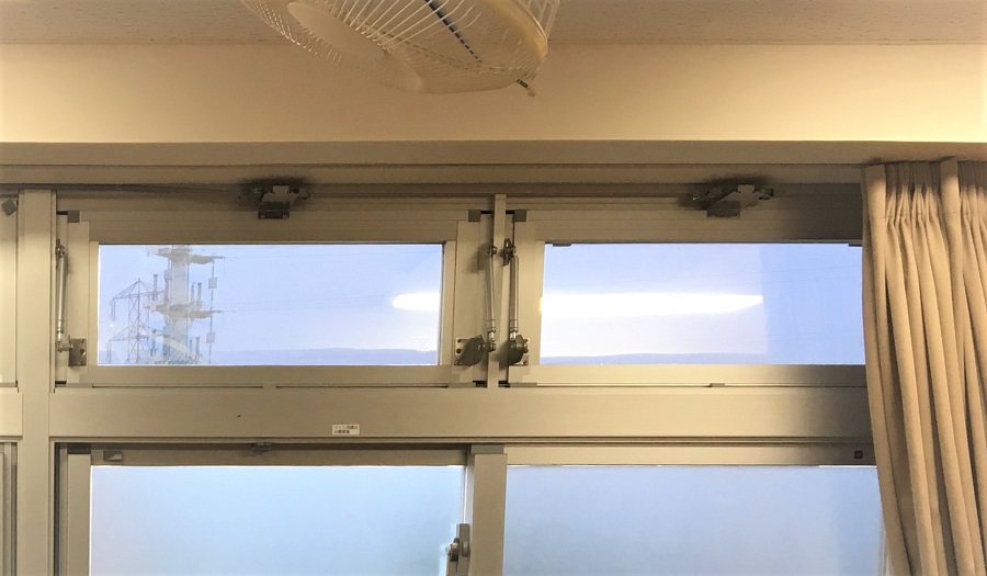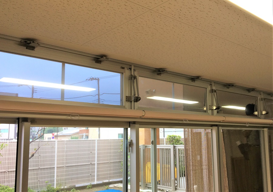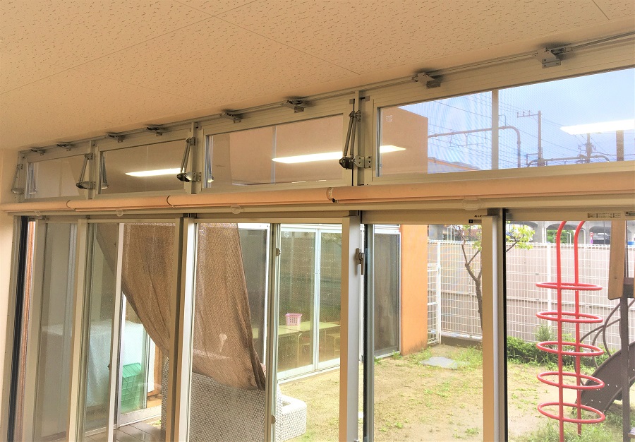 ‍児童施設の窓、欄干の部分に断熱フィルムを貼付。