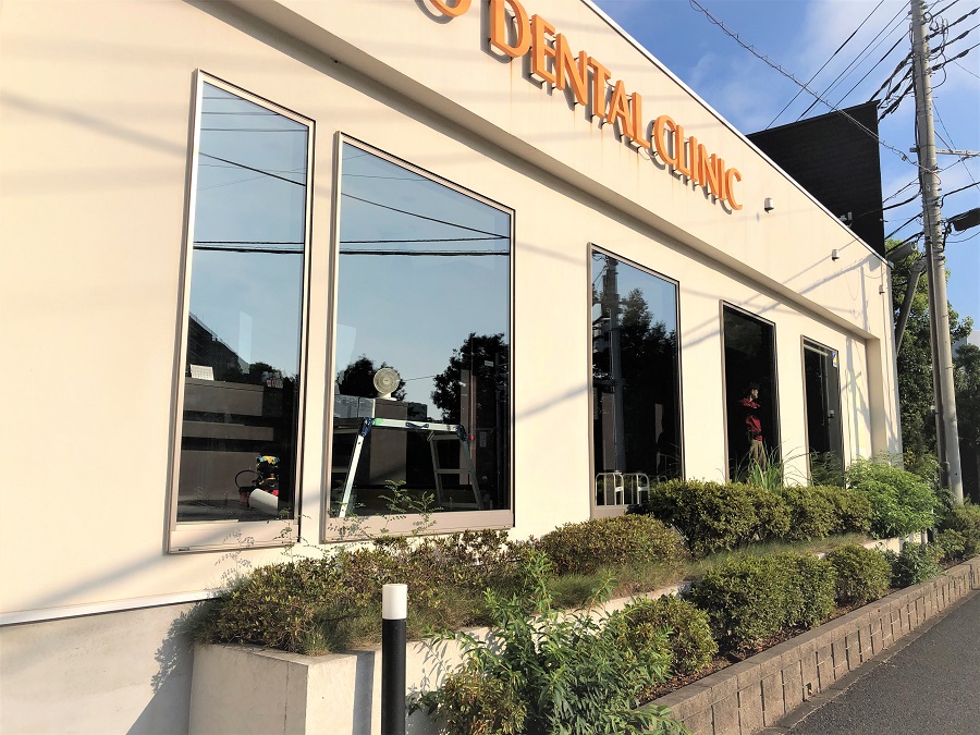 クリニックの大きな壁面のガラス窓に断熱フィルムを貼り付け施工。こちらは施工前の窓。