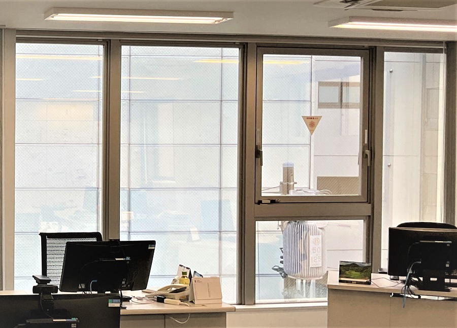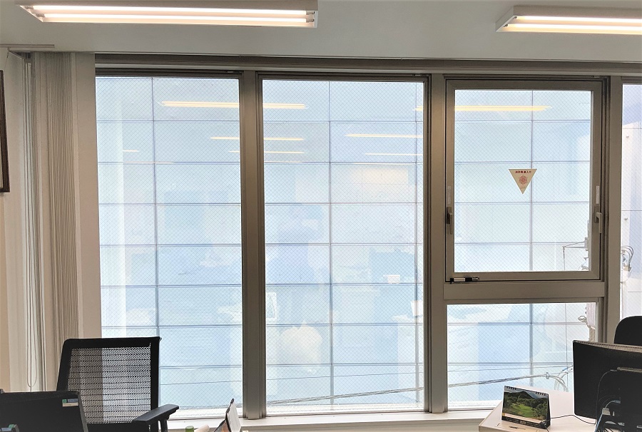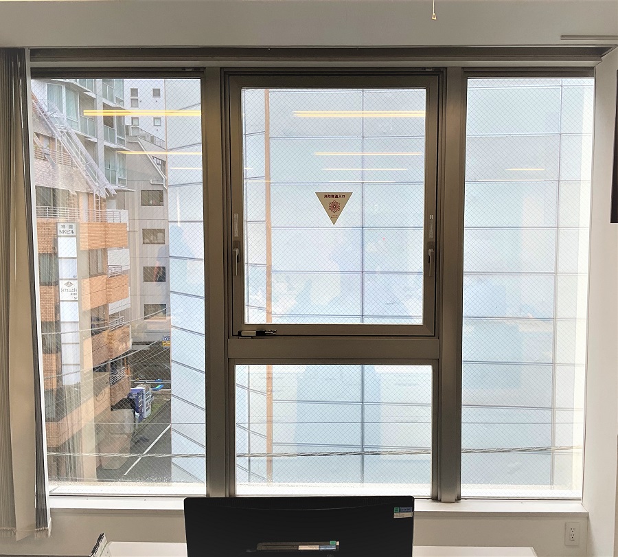 ‍ビル上層のオフィスの窓に断熱フィルムを貼付け。