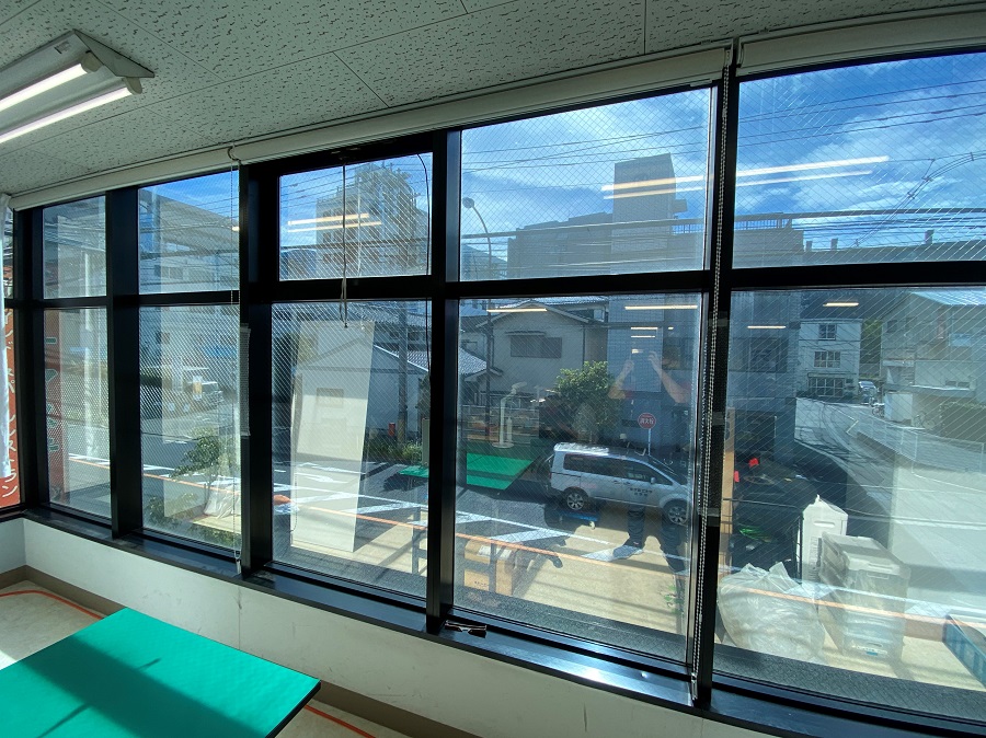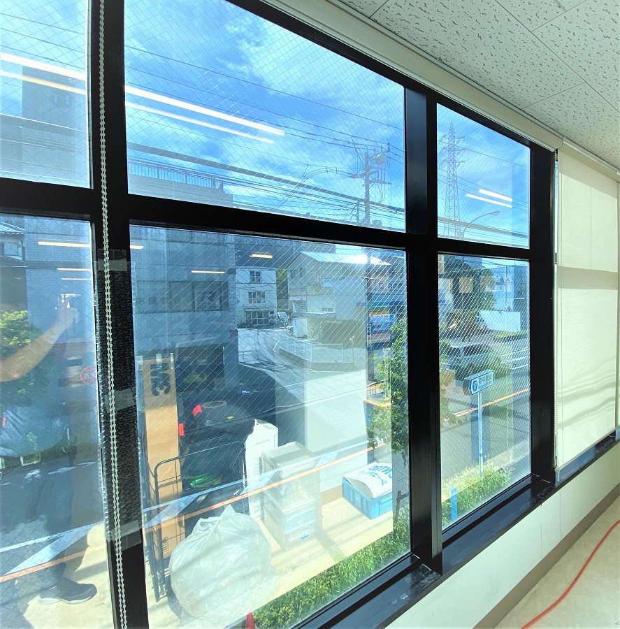 ‍商業ビル上階のオフィスの窓に断熱フィルムを貼付け。