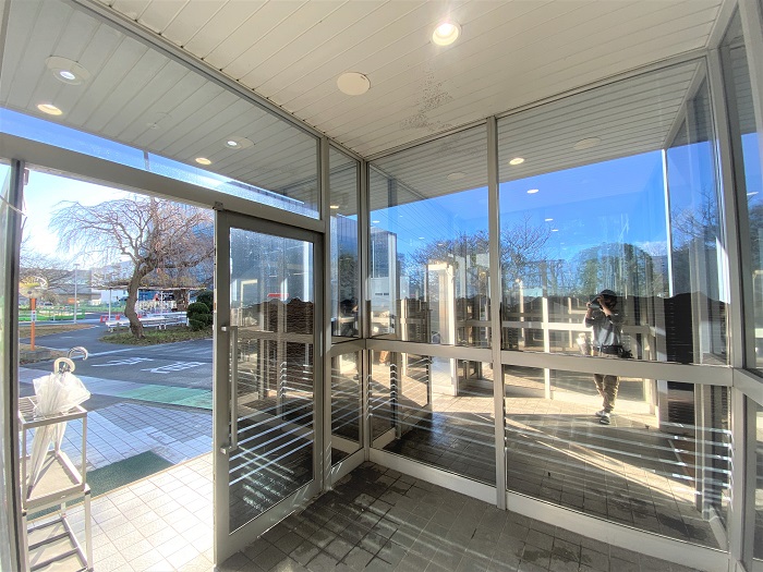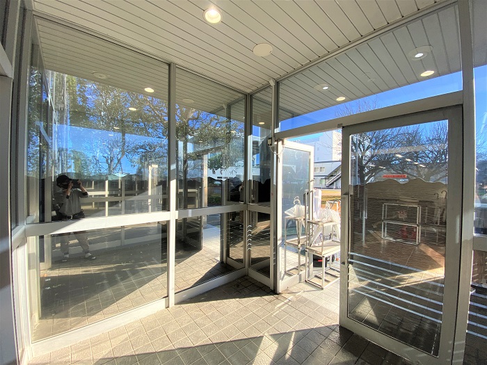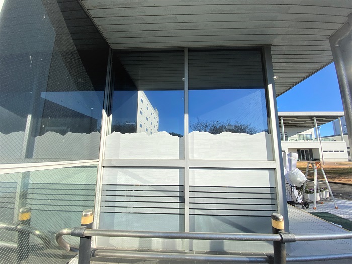 ‍施設入り口の窓ガラスに断熱フィルムを貼付け施工。