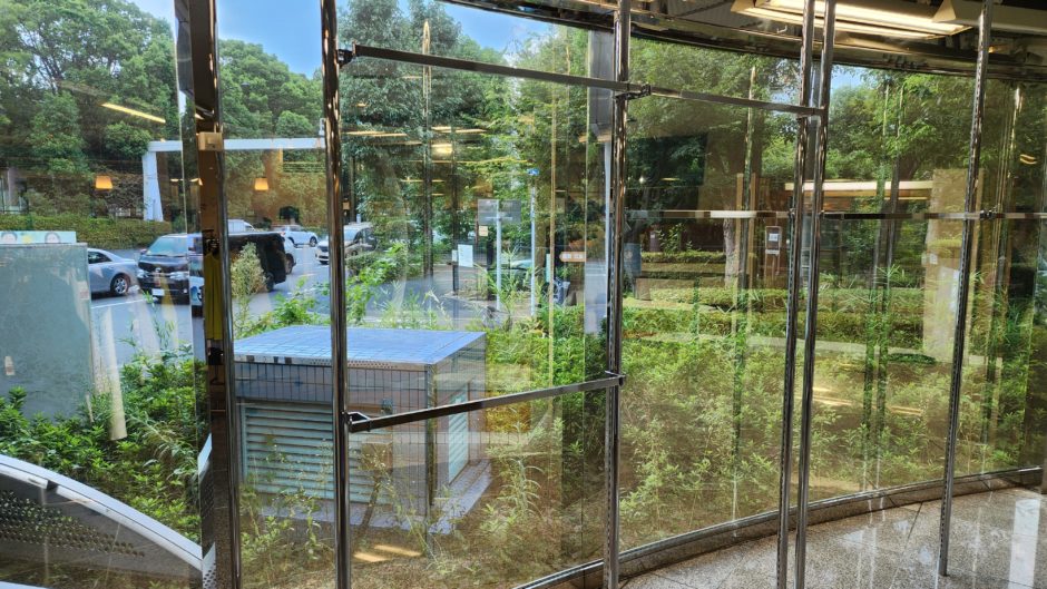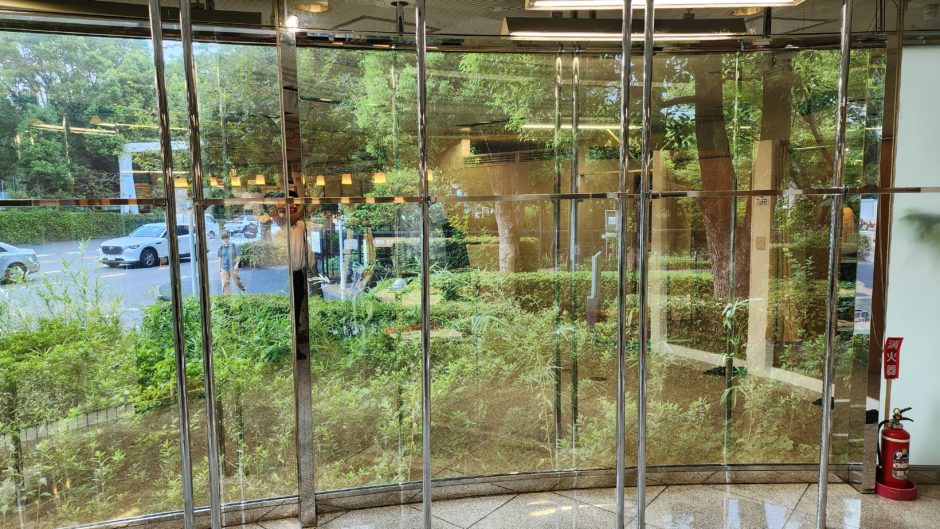 ‍オフィスビル一回のアールのあるウィンドウに断熱フィルムを貼り付け施工。