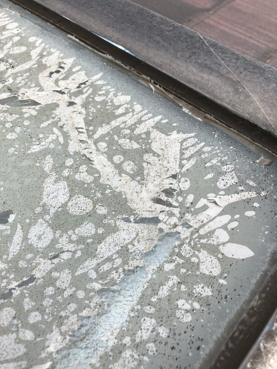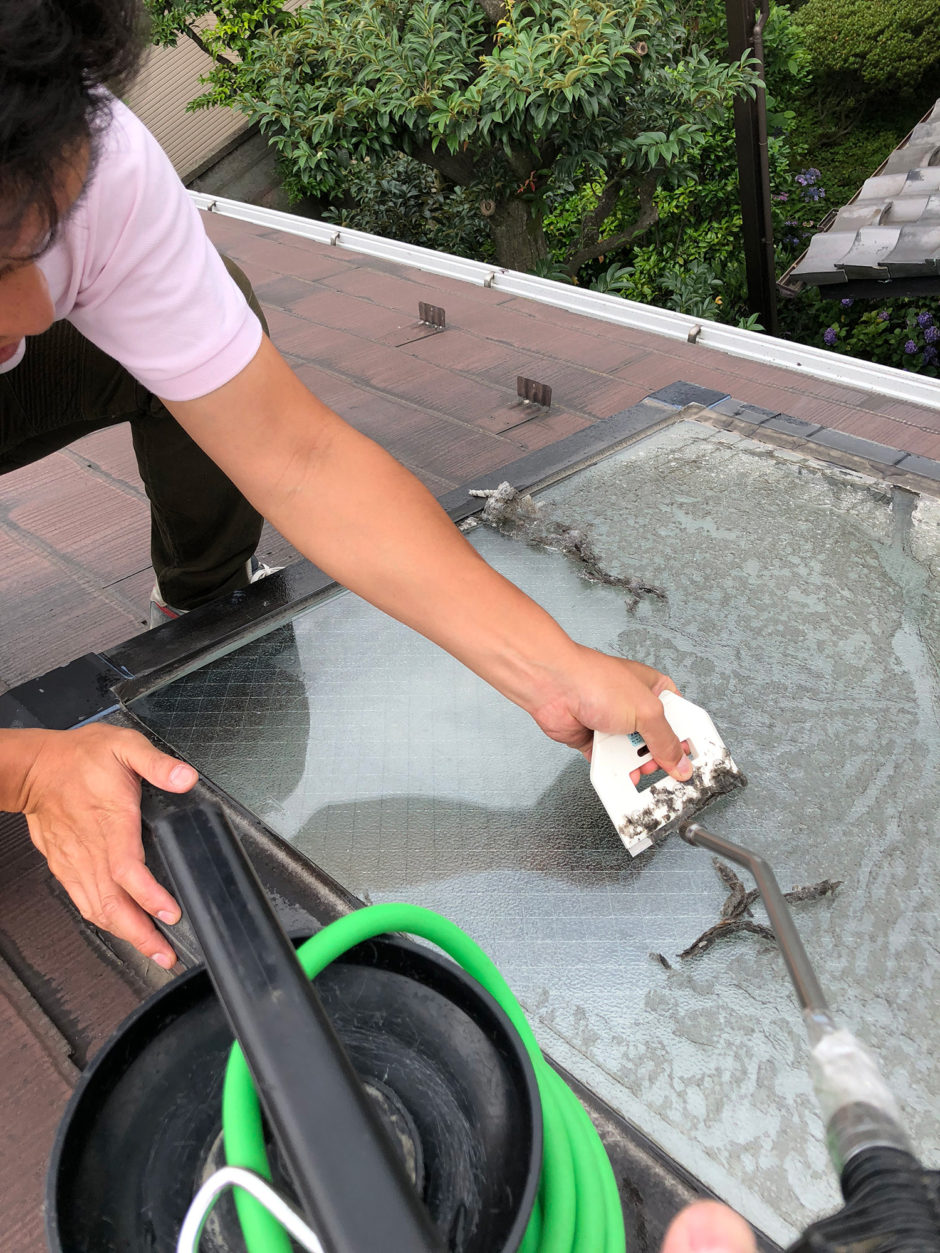 天窓の施工前。10年前に貼られた断熱フィルムを貼り替えます。天窓の場合、年中太陽光を浴び熱を帯び続けるため通常の窓に貼るより劣化があるのですが、その断熱効果から貼り替えのご依頼をいただきました。なお、フィルムの経年劣化については貼る場所により異なるため、ご心配の方はScopeまでお気軽にご相談ください。