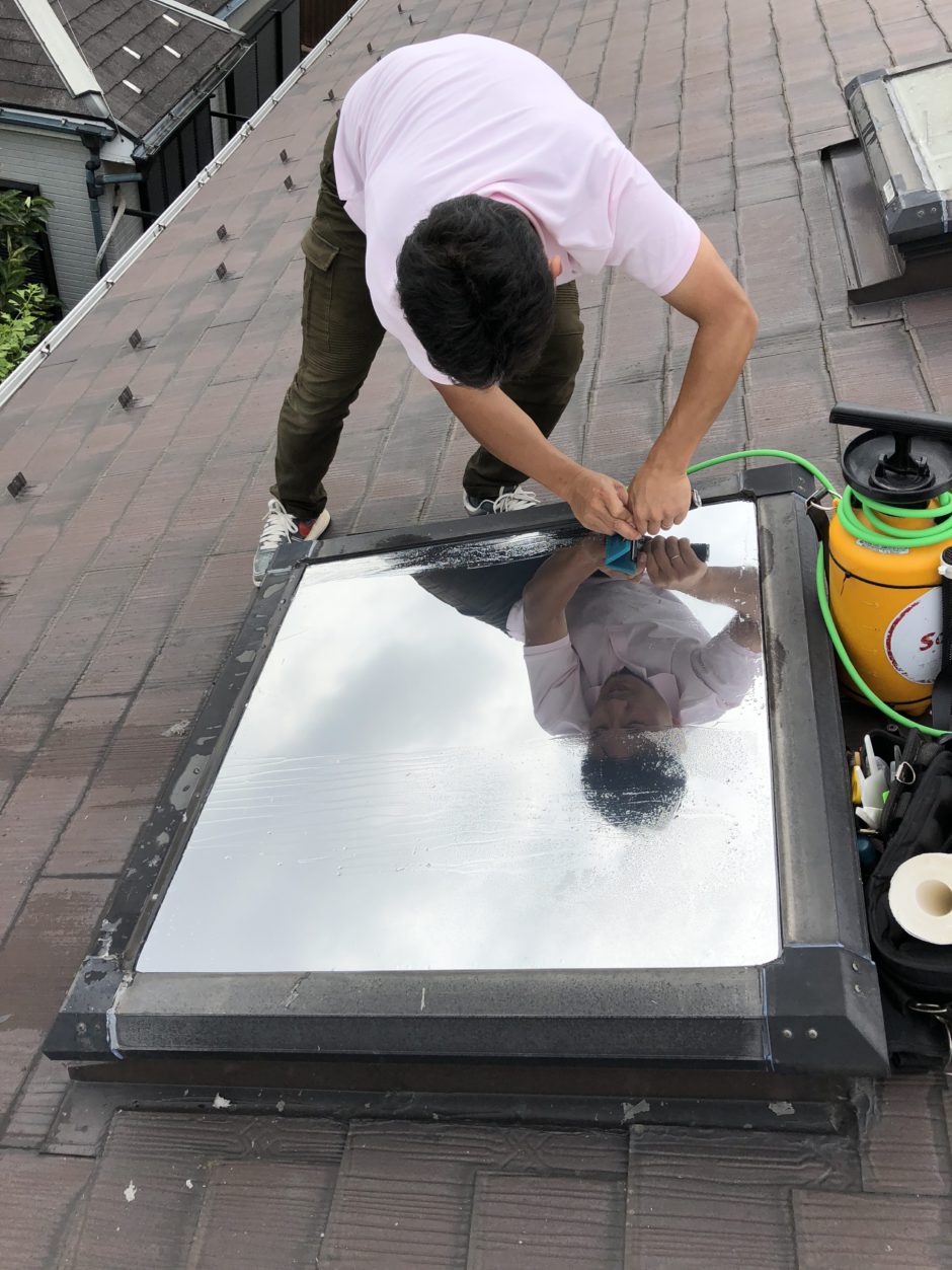 施工中。天窓には容赦なく太陽光が当たり、気温の高い季節はその分室内が暑くなるため、断熱フィルムを強くお勧めします。