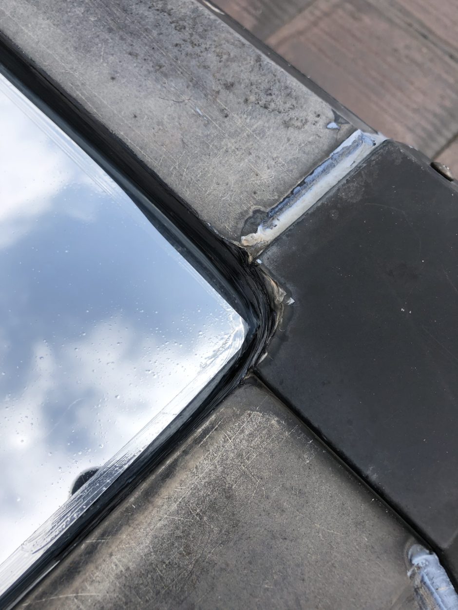 施工後の天窓。断熱フィルムはマジックミラー効果があるため、空が映り込んでいます。