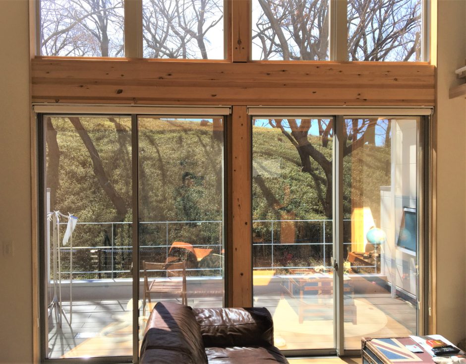 ‍居室の吹き抜け部分おおきな窓に断熱フィルムを貼り付け。