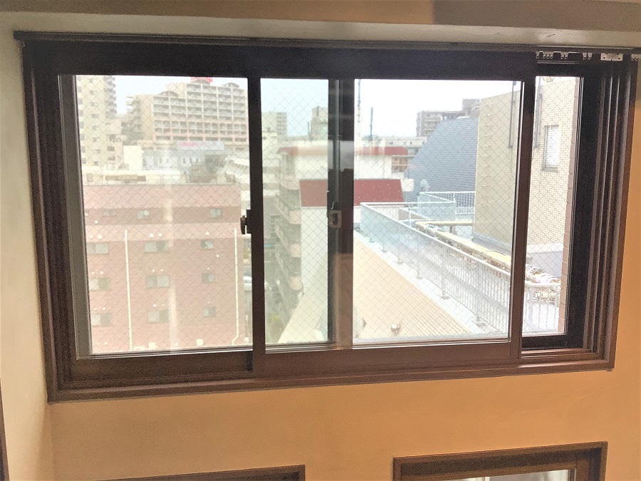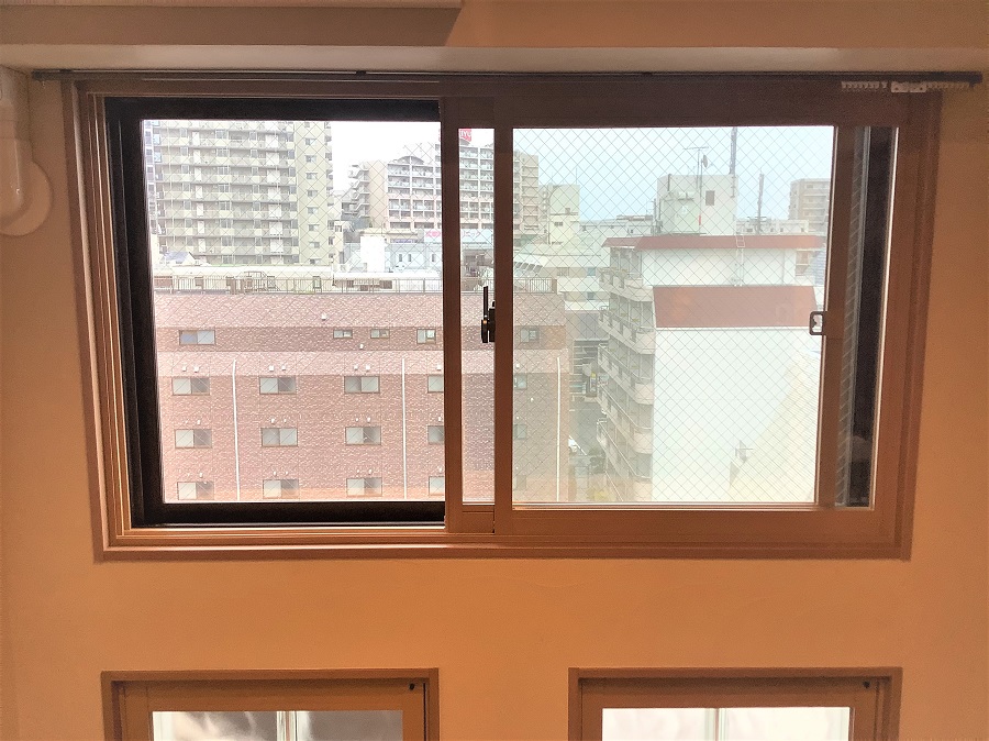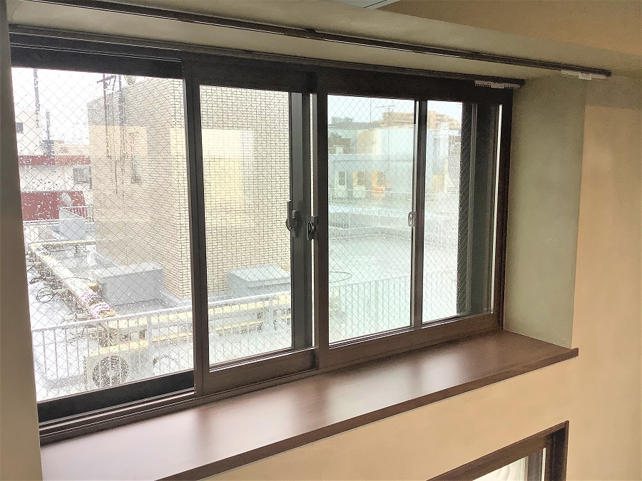 ‍居室の引き違い窓の外サッシ部に断熱フィルムを貼付。