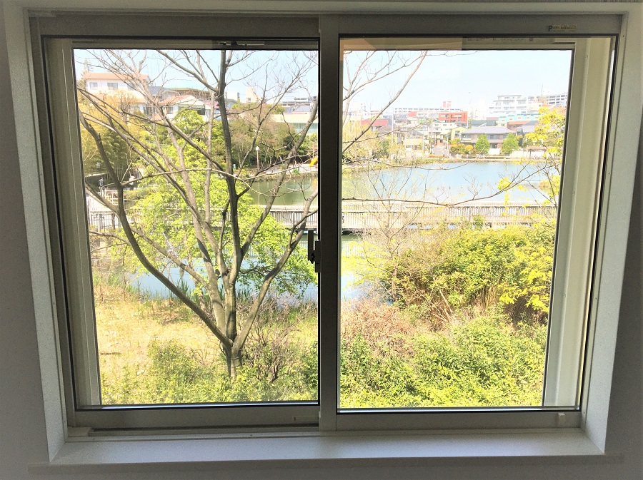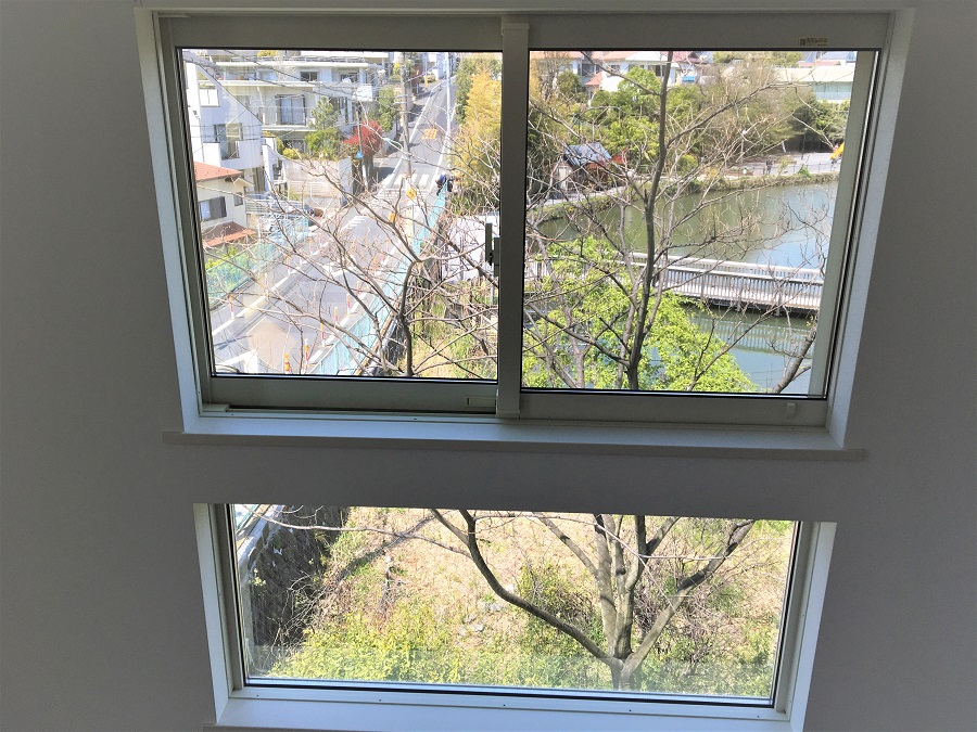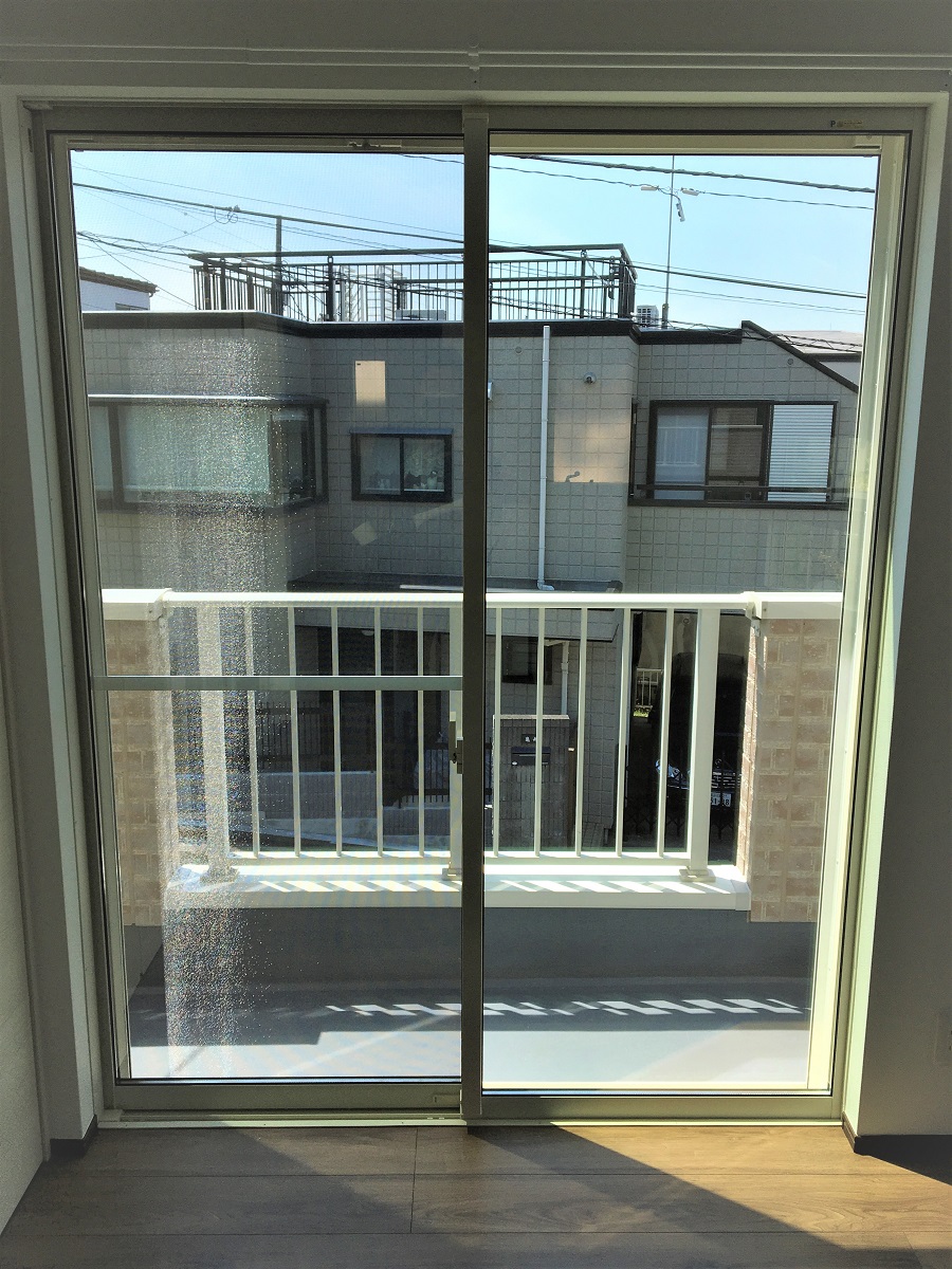 ‍居室の引き違い窓に断熱フィルムを貼付。