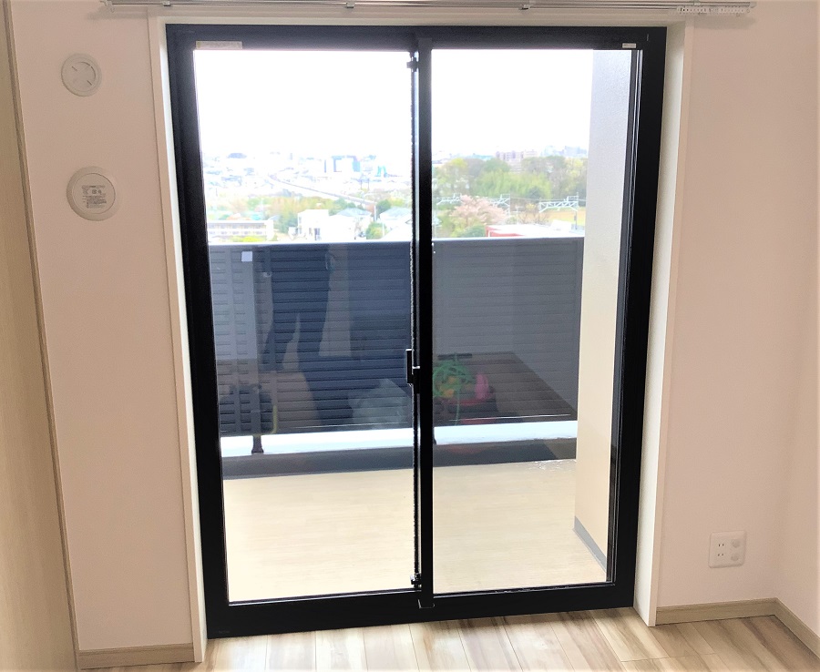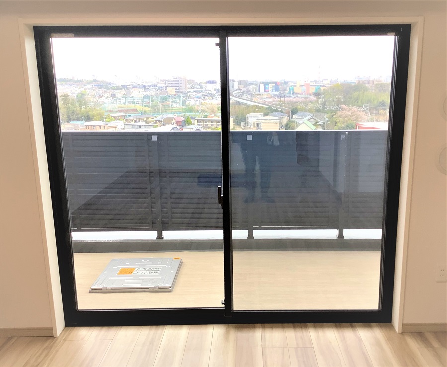 ‍高層マンションの居室掃き出し窓に断熱フィルムを貼付。