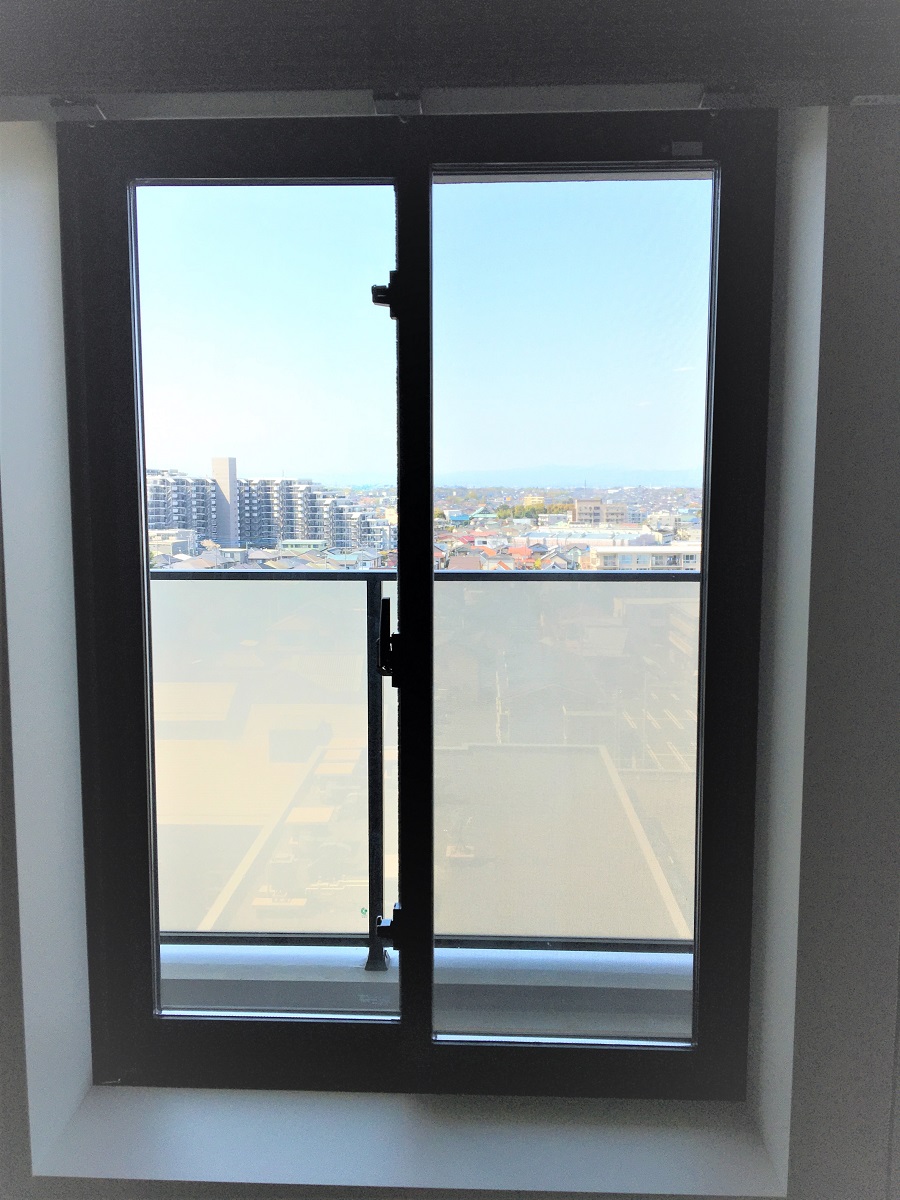 ‍マンション上層階のベランダへの掃き出し窓に断熱フィルムを貼付。
