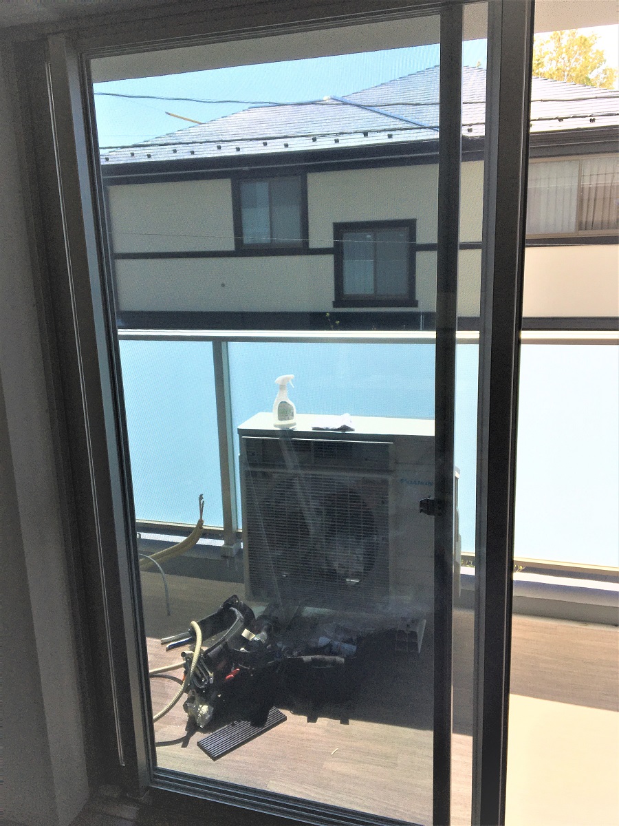‍戸建て住宅の居室に断熱フィルムを貼り付け。