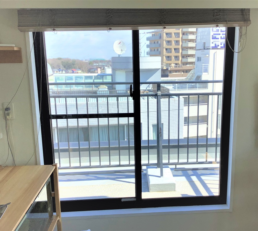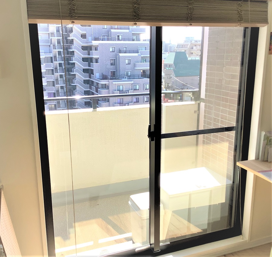 ‍高層マンションの上層階の居室窓に、断熱フィルムを貼り付け。