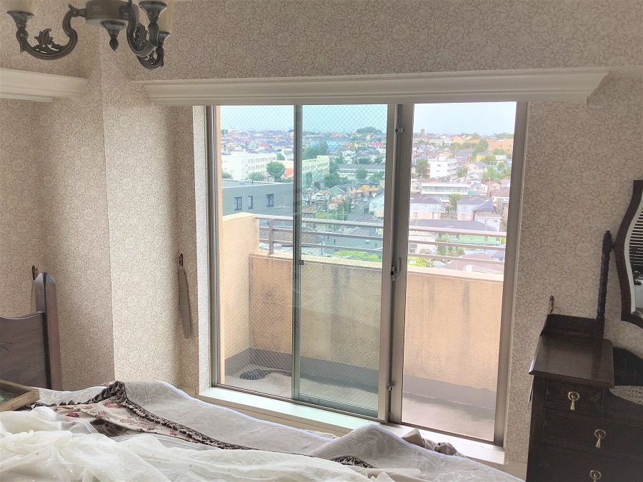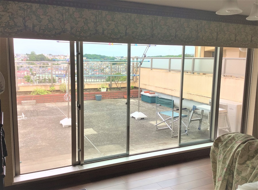 ‍住居居室、テラスに面した大きな窓に断熱フィルムを貼付。日射熱を防ぎます。