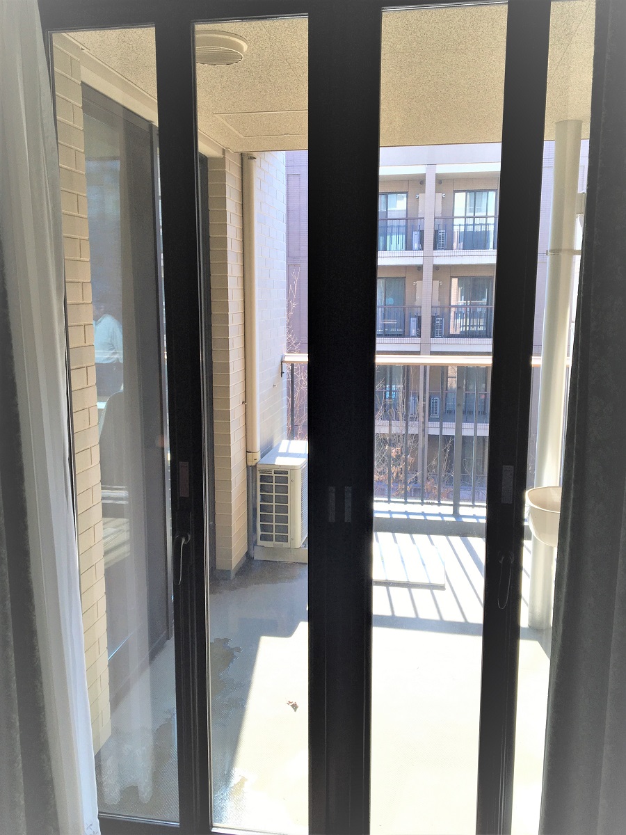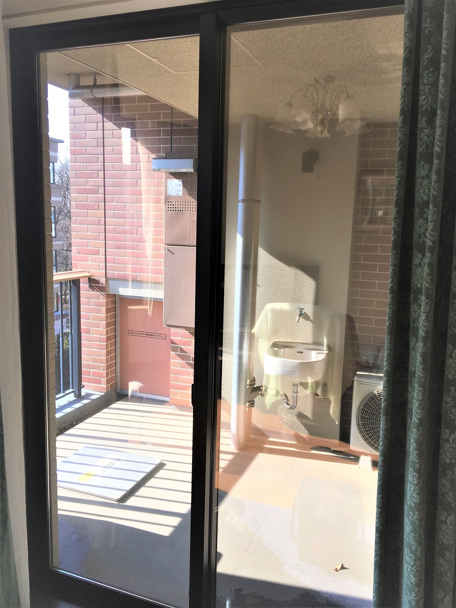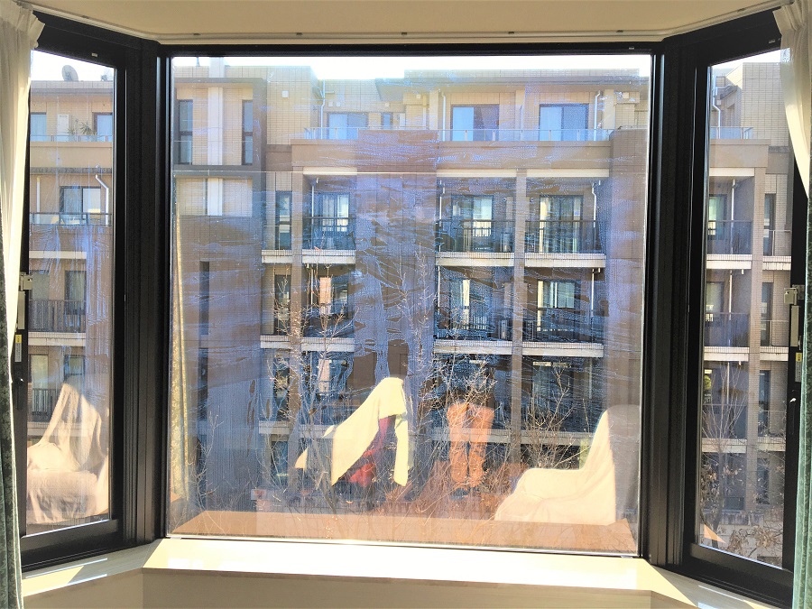‍住居の窓に断熱フィルムを貼り付け。こちらは出窓に。反射するフィルムで目線もカット。