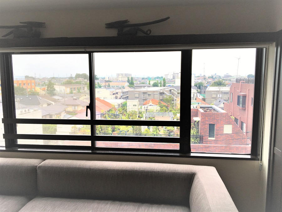 ‍マンション上層階の居室窓に断熱フィルムを貼り付け。