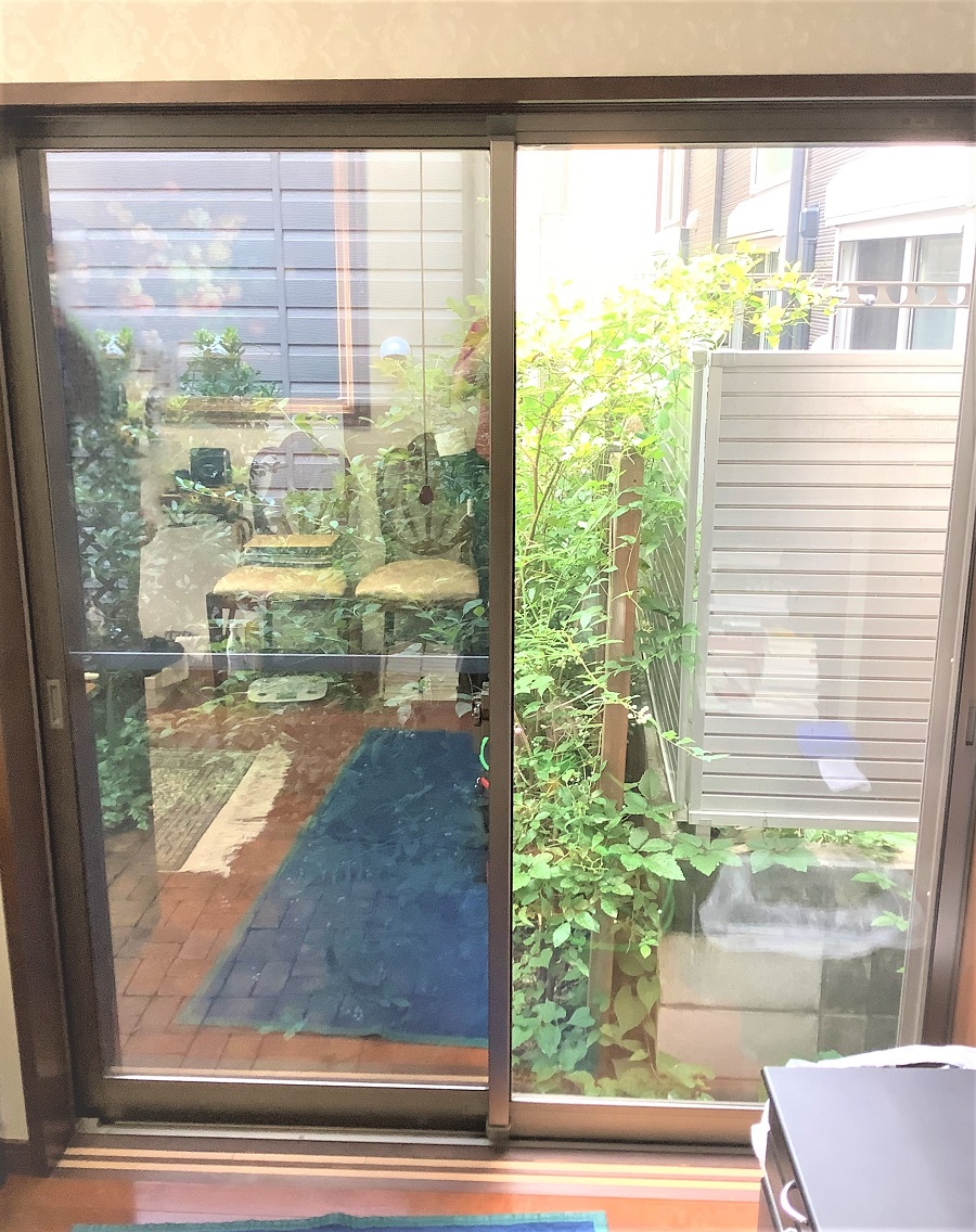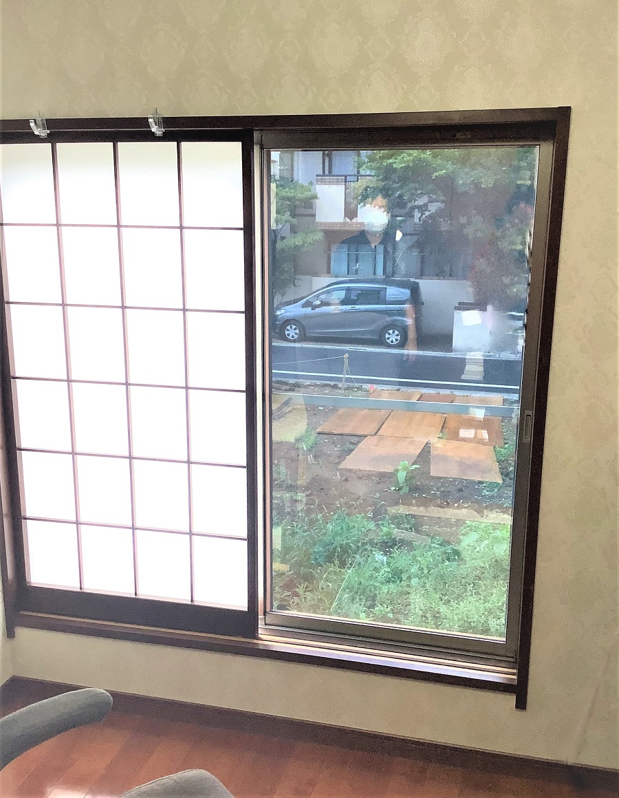‍いつもは障子が入っている向かって右窓は施工なし。左側のみの施工。外から見るとミラーのような見え方で目線のカットにも。