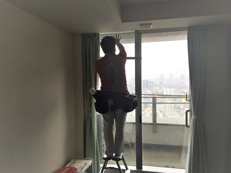 ‍高層マンションの居室窓に断熱フィルムを貼り付け。