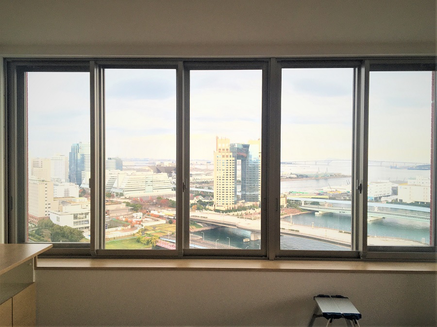 ‍高層マンションの居室窓に断熱フィルムを貼付け。