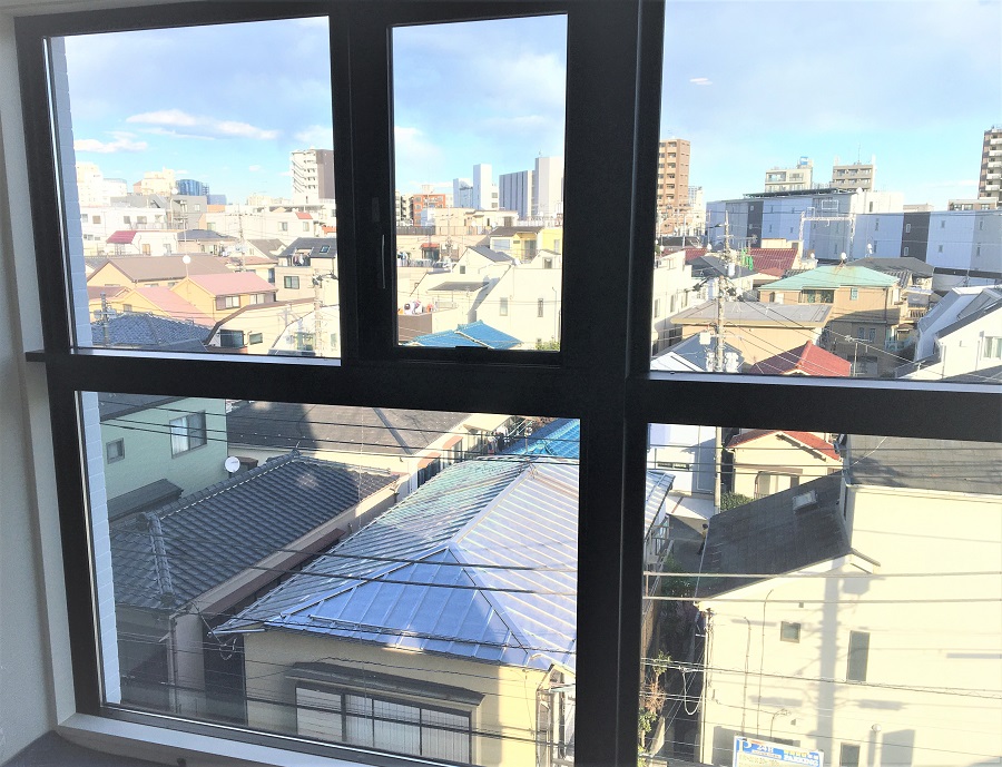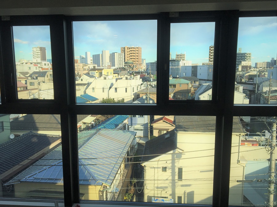 ‍マンション上層階の大きくデザインされた窓ガラスに、断熱フィルムを貼付け。
