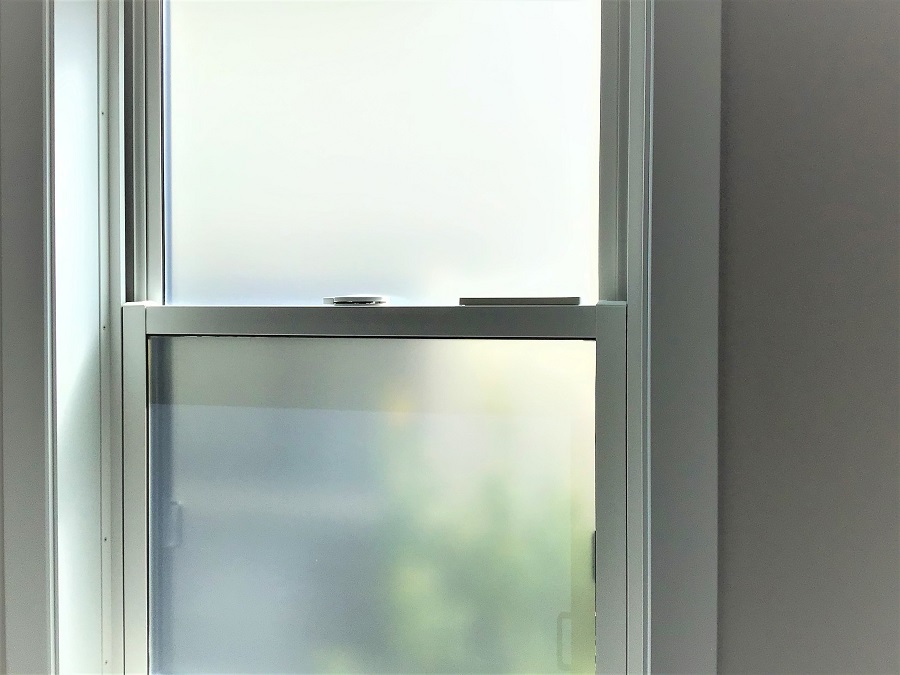 ‍住居の引き違い窓にスリガラスタイプの目隠しフィルムを貼付け。