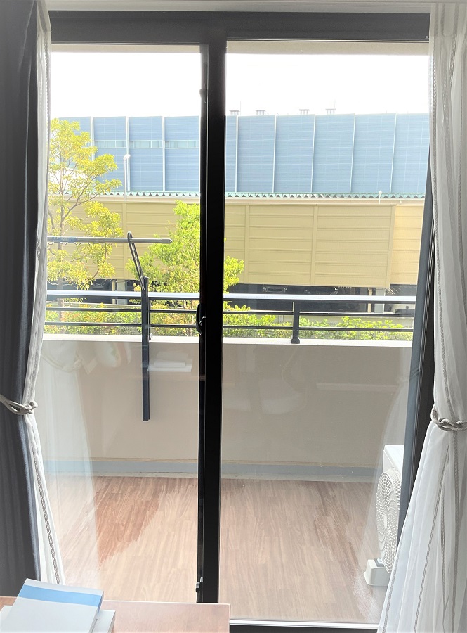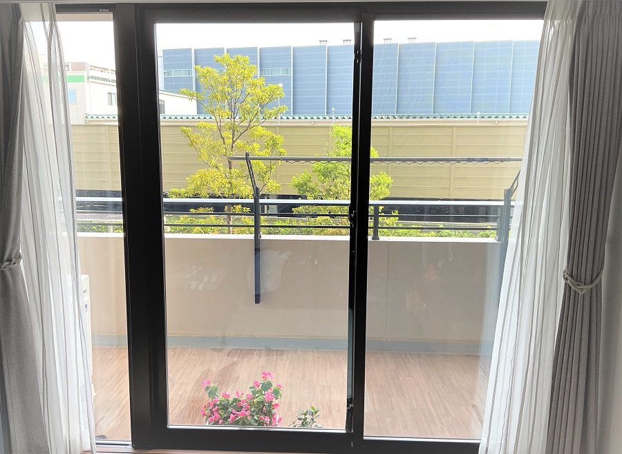 ‍住宅居室の掃き出し窓に断熱フィルムを貼付け。