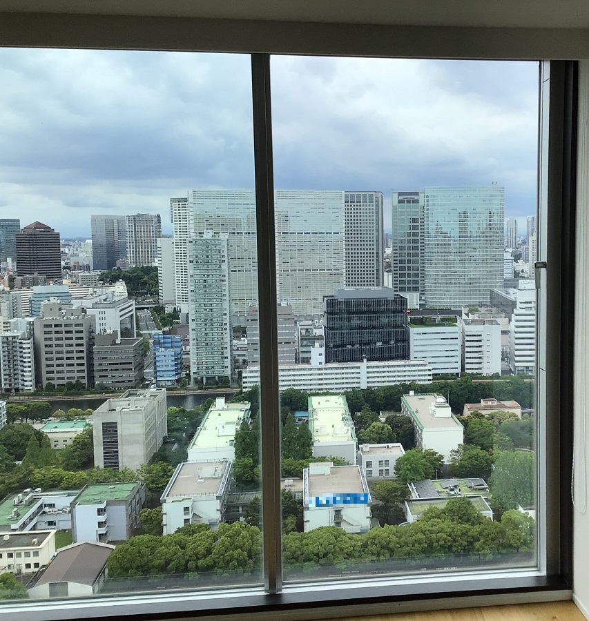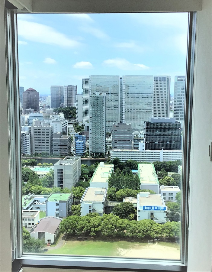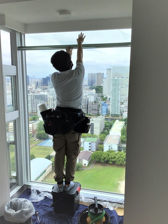 ‍高層マンションの居室窓に断熱フィルムを貼付け。