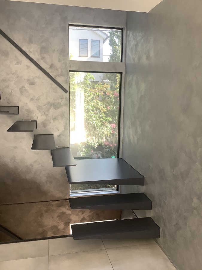 ‍戸建て住宅の室内、階段室の吹き抜けにつながる窓に断熱フィルムを貼付け。