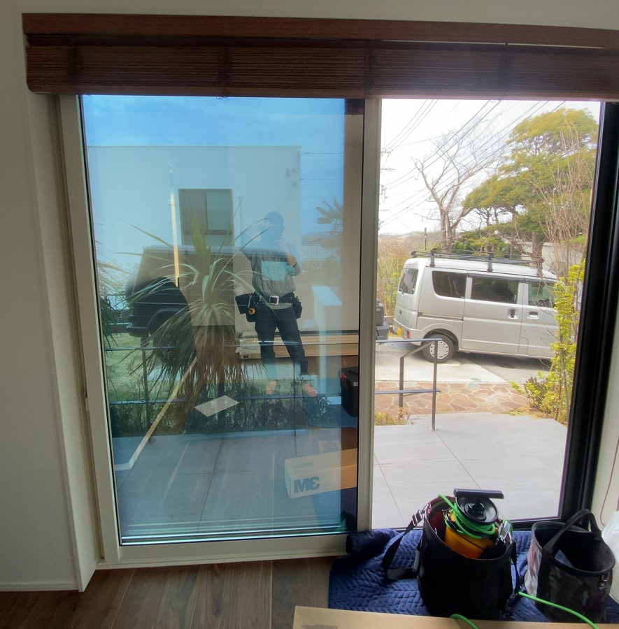‍新築住宅の窓に断熱フィルムを貼付け。今回使用したフィルムは、3M社製の『アンバー35』です。