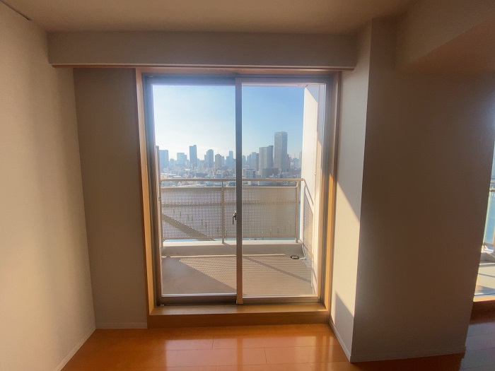 ‍高層マンションの居室窓に断熱フィルム貼付け。今回使用したフィルムは、サンゲツ社製の『コア70 GF1102』です。