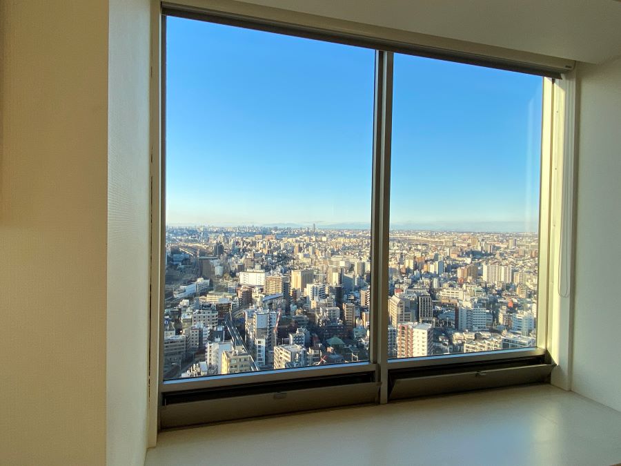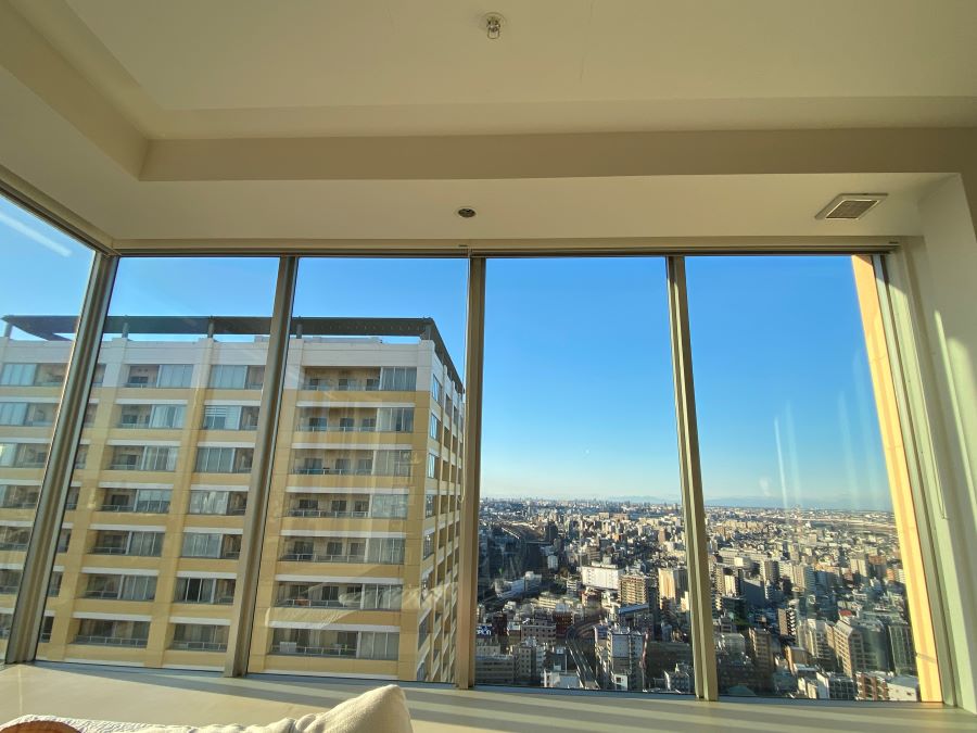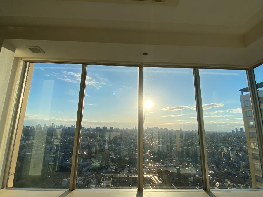 ‍高層マンションの居室窓に断熱フィルムを貼付け。