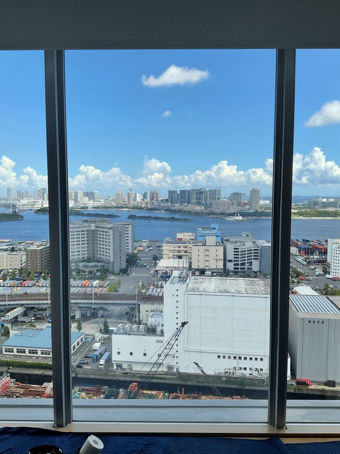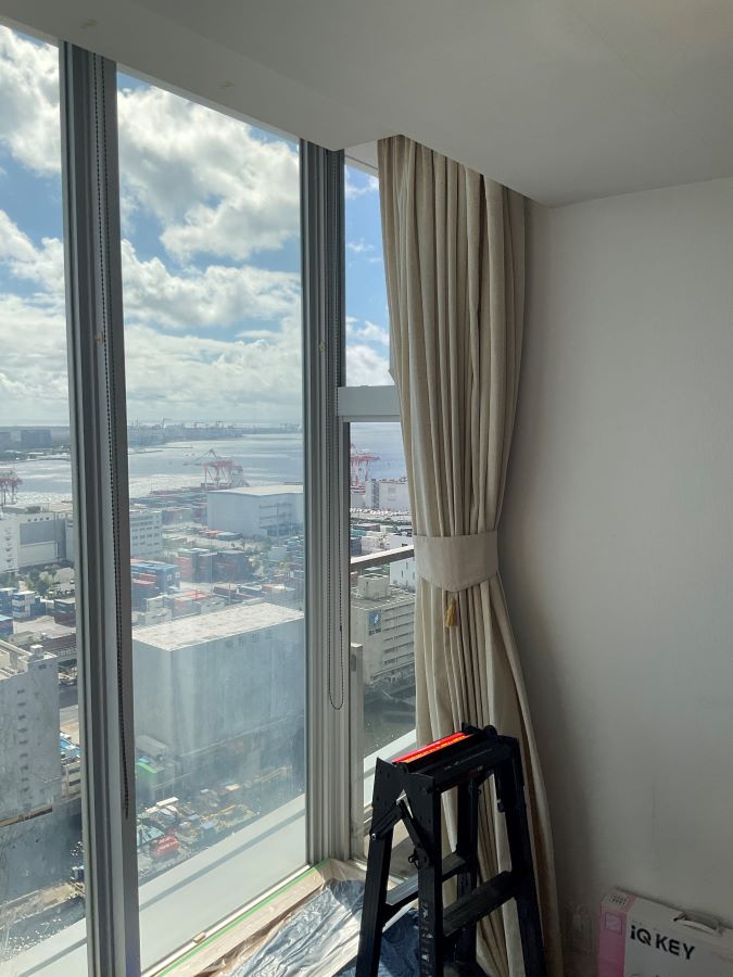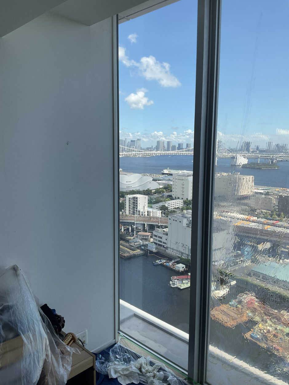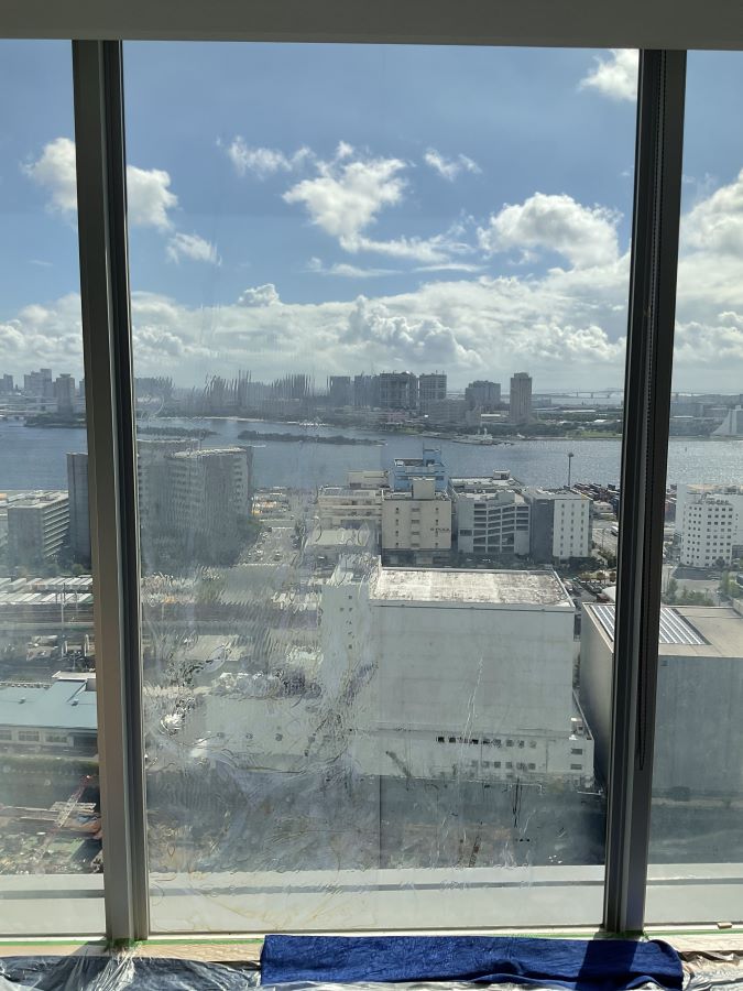 ‍高層マンションの窓の断熱フィルム貼り替え施工です。こちらは施工前の様子。接着剤が劣化して水あめのようになっています。