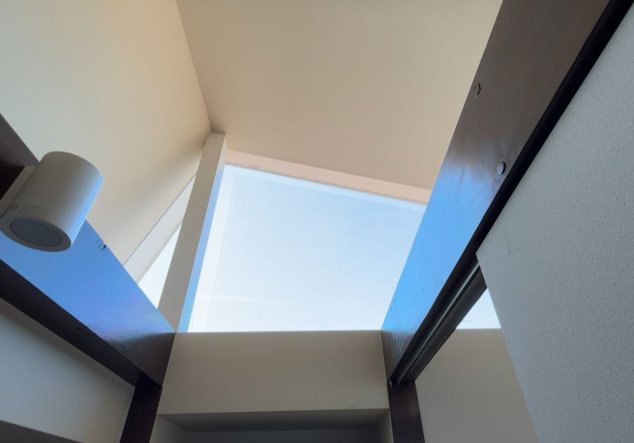 ‍戸建てご住居、吹き抜け部分の変形窓に断熱フィルムを貼り付け。