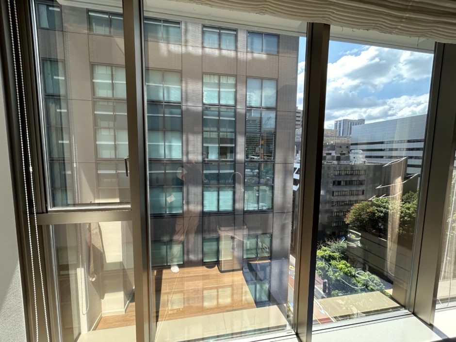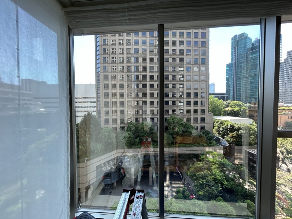 ‍高層マンションの窓に断熱フィルムを貼り付け施工。
