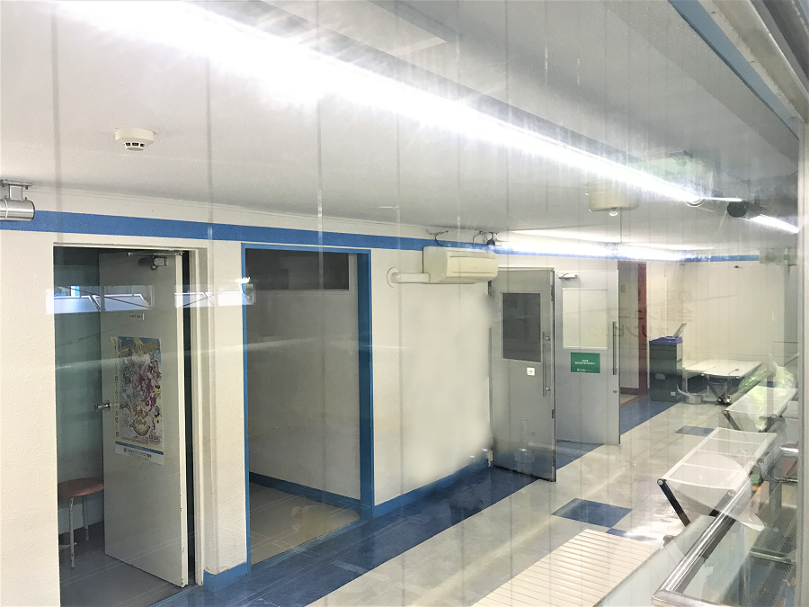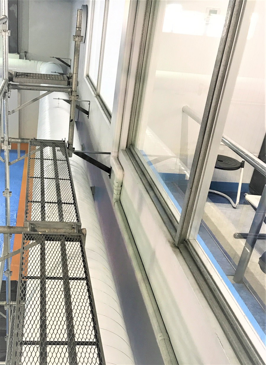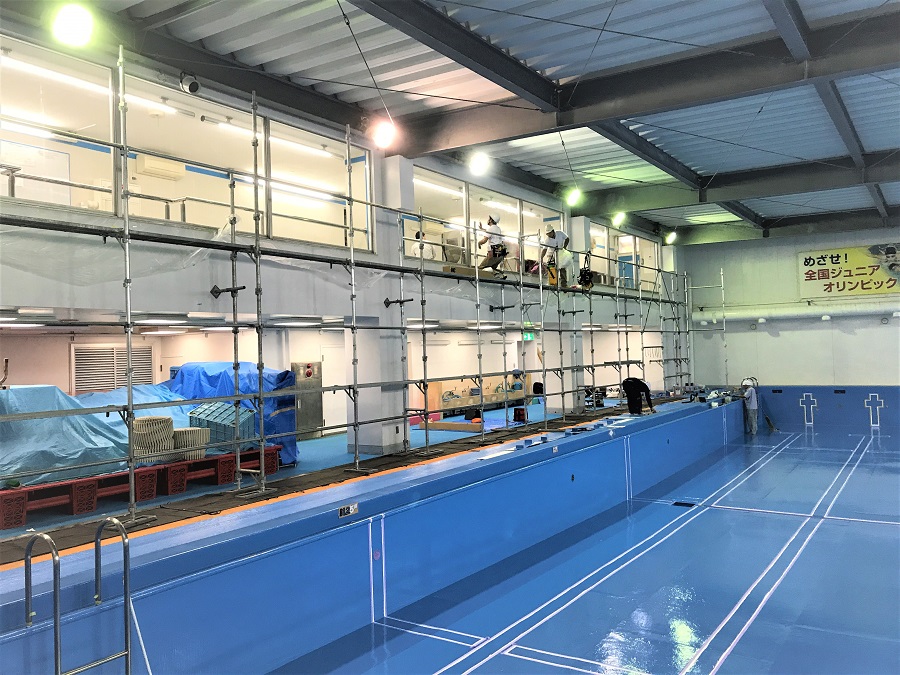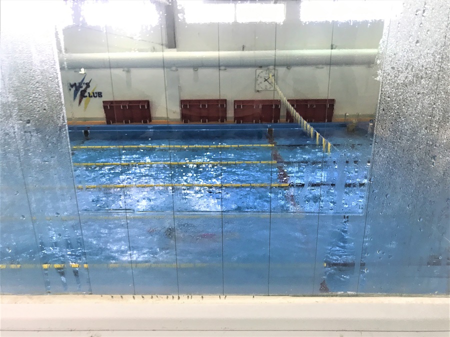 ‍プール施設の窓ガラスに防曇フィルムを貼付。