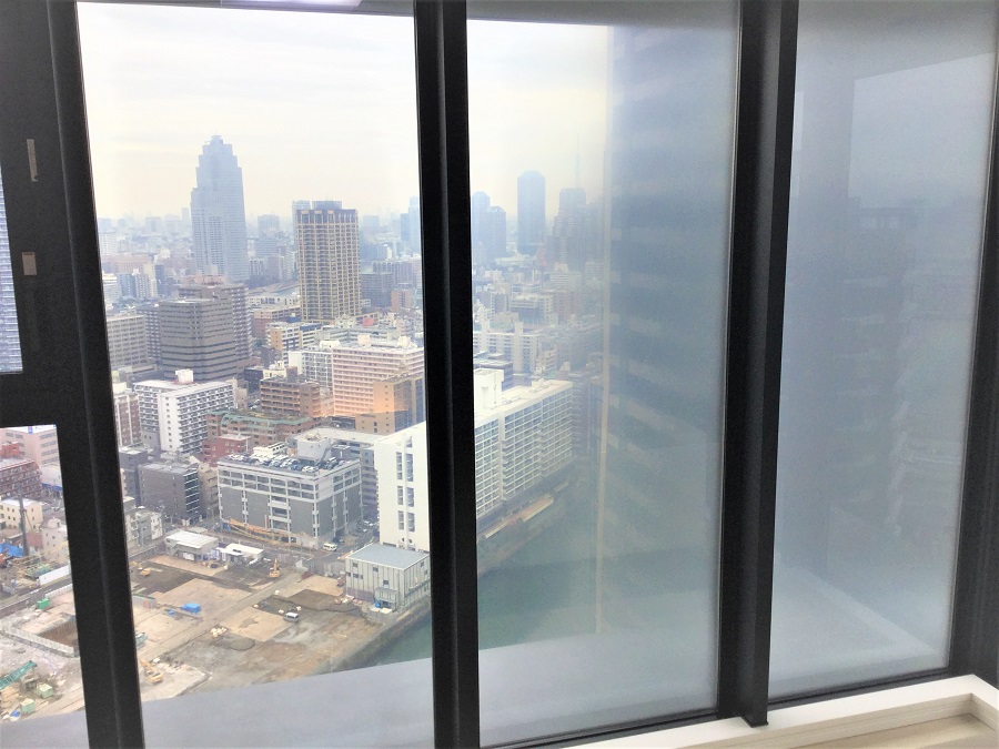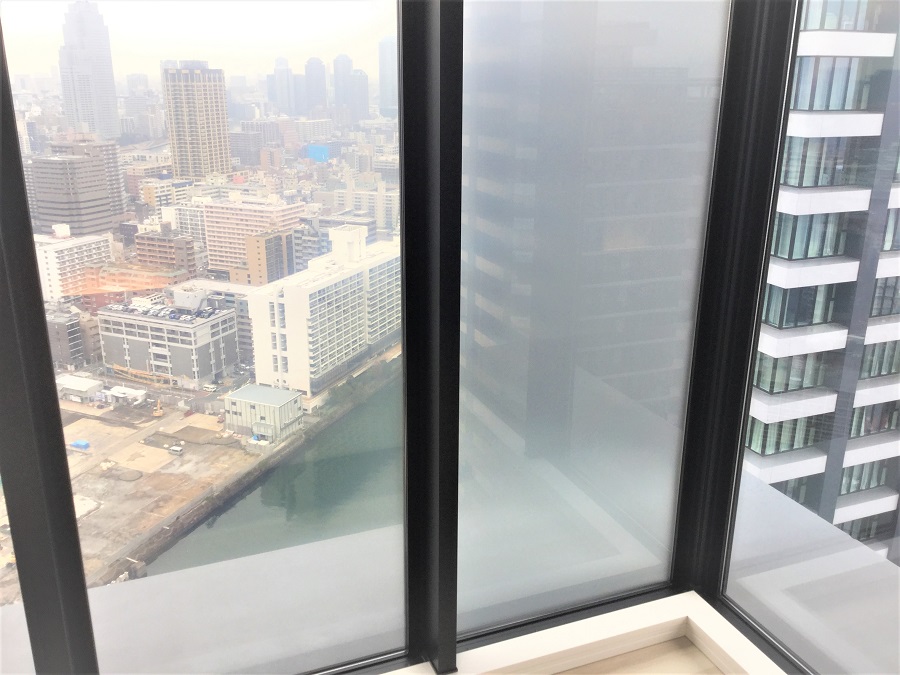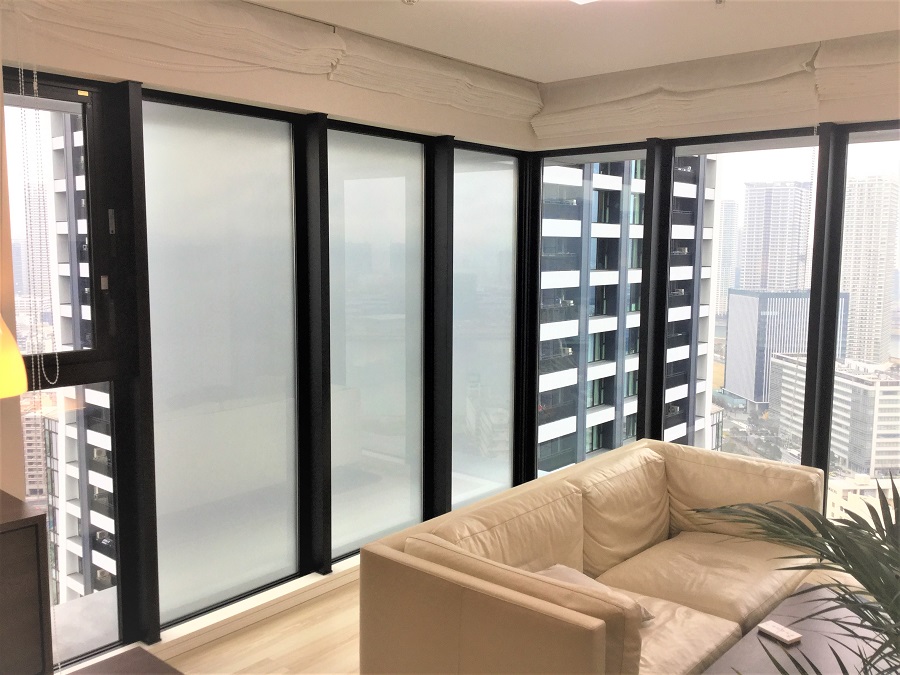 ‍高層マンションの居室の窓に視界制御フィルムを貼り付け。