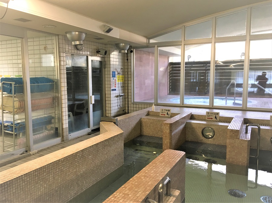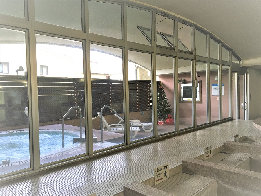 ‍サウナ施設の窓に防曇フィルムを貼り付け。