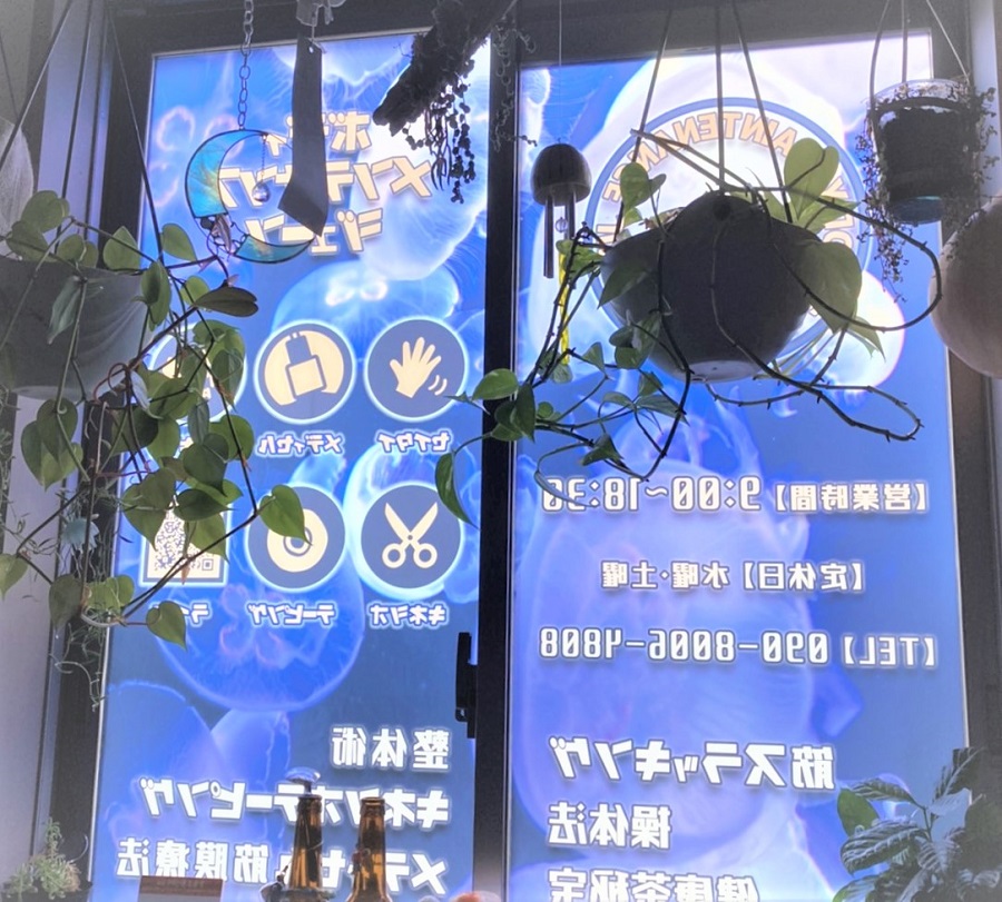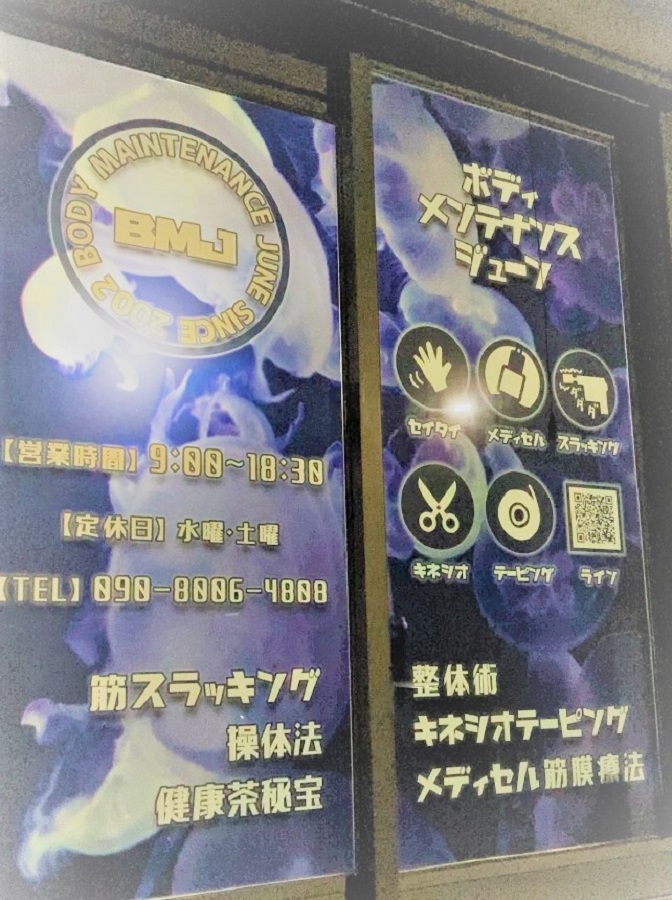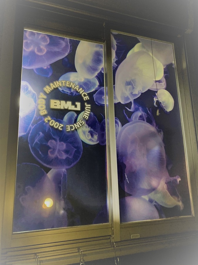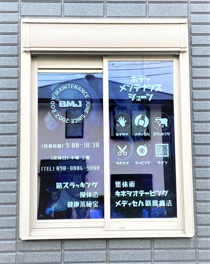 ‍ボディメンテナンス施設の窓にオリジナルプリントシートを貼付け。