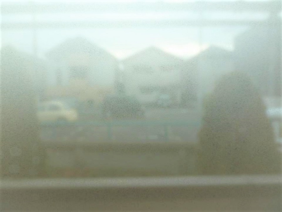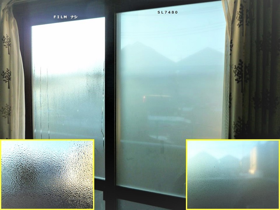 ‍写真向かって右側がフィルム施工済みの窓。左はフィルム無し。結露の付き方の違いが顕著です。