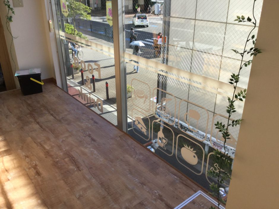 ‍飲食店の窓に店舗ロゴとイメージイラストを貼り付け