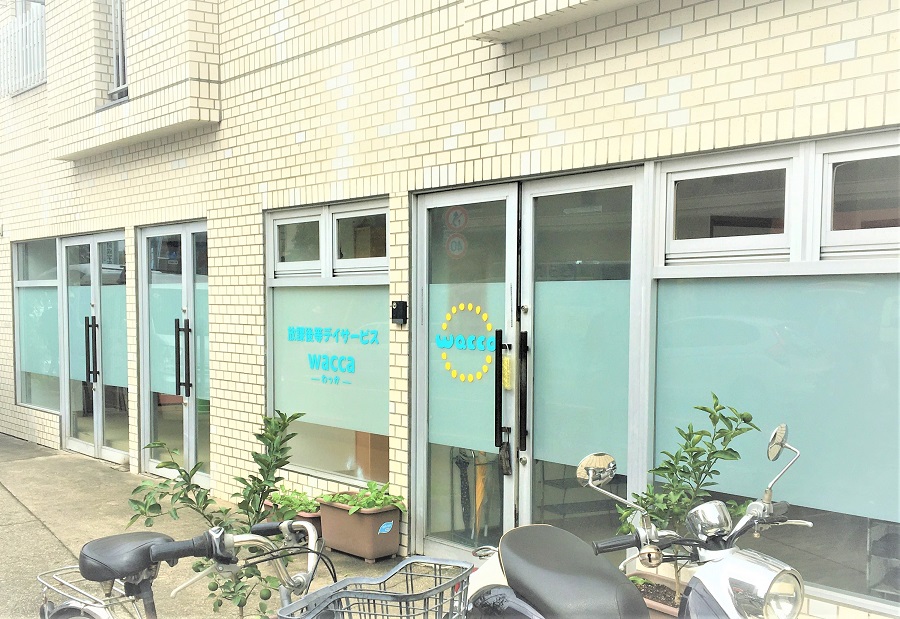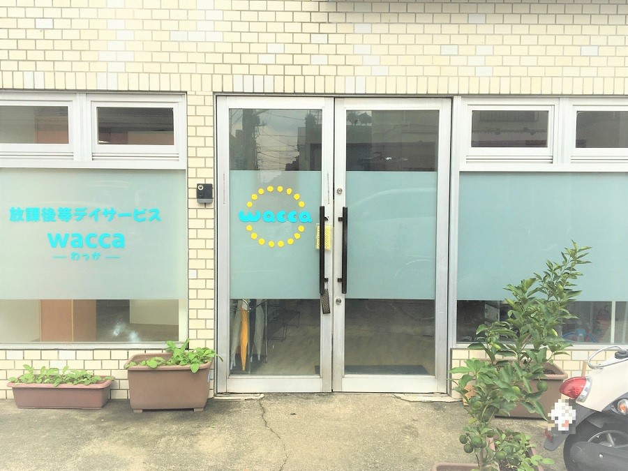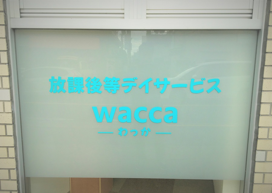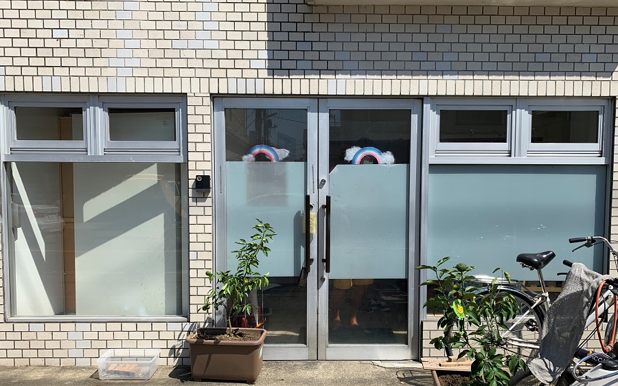 ‍帯状の目隠しフィルムとドア部分、中央フィックス窓部にロゴマークと施設名のカッティングシートを貼付。