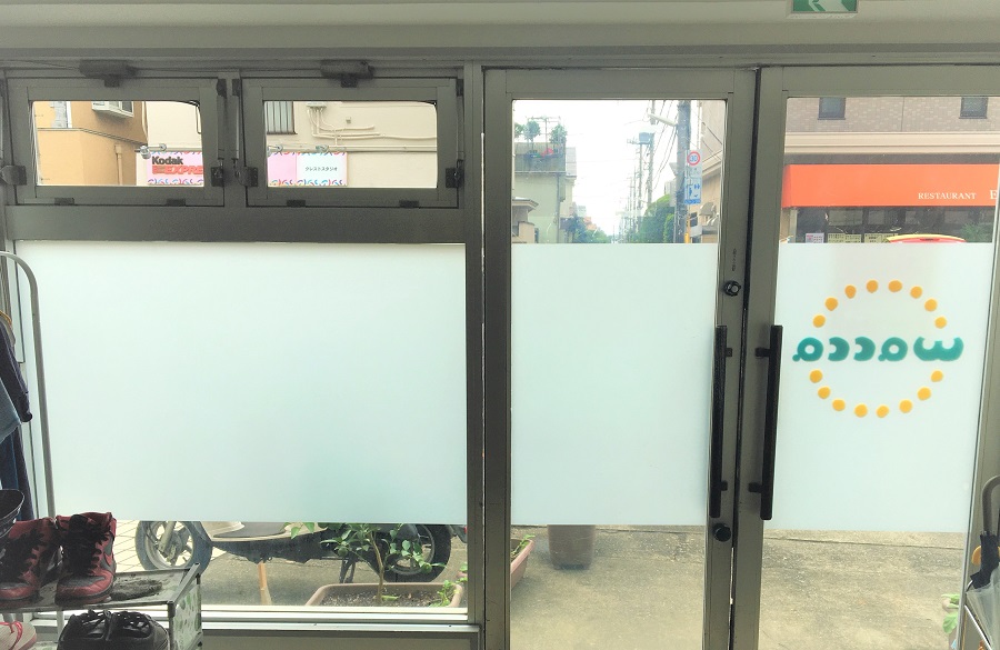 ‍施設路面側の窓に目隠しフィルムとカッティングシート。