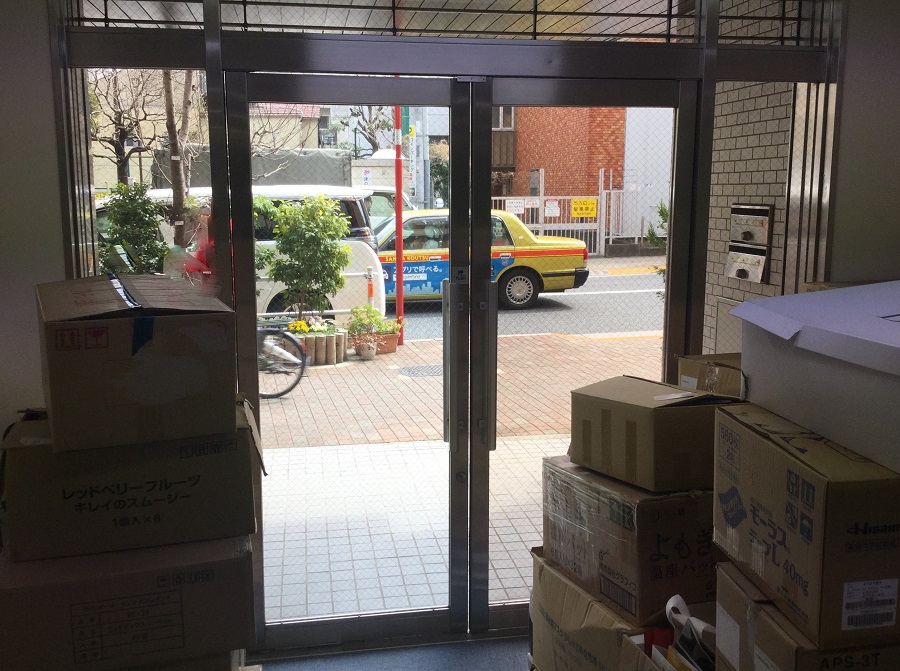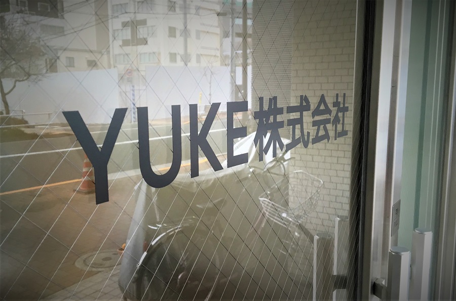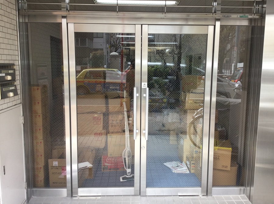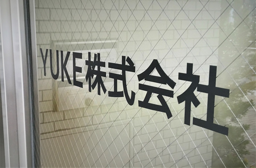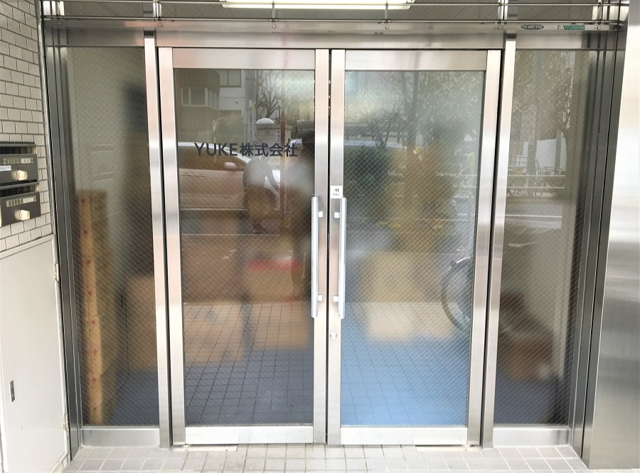 ‍施設入り口の両開き扉に目隠しフィルムおよび会社名のカッティングシートを貼付。