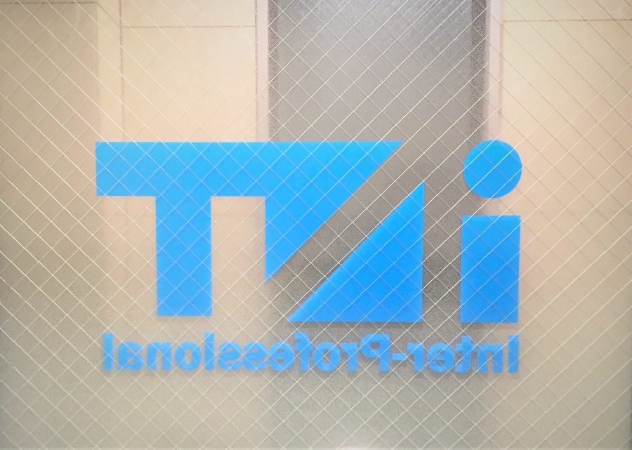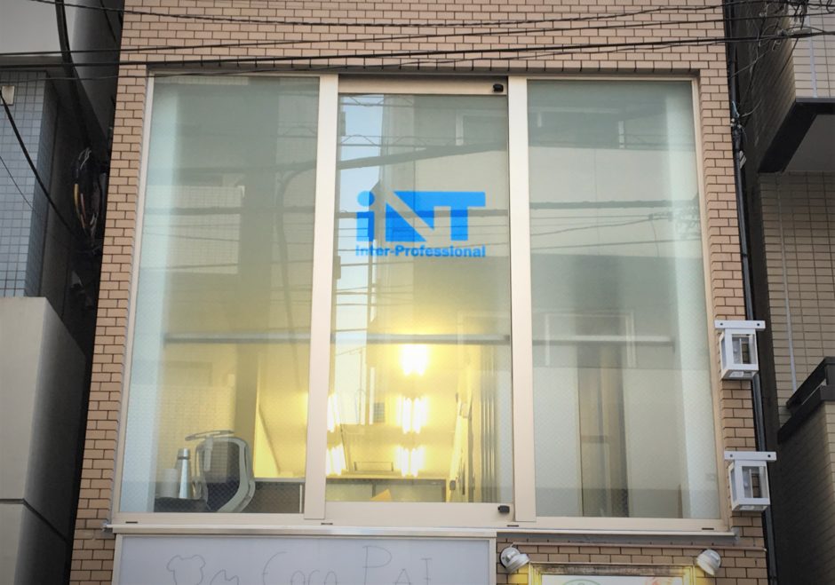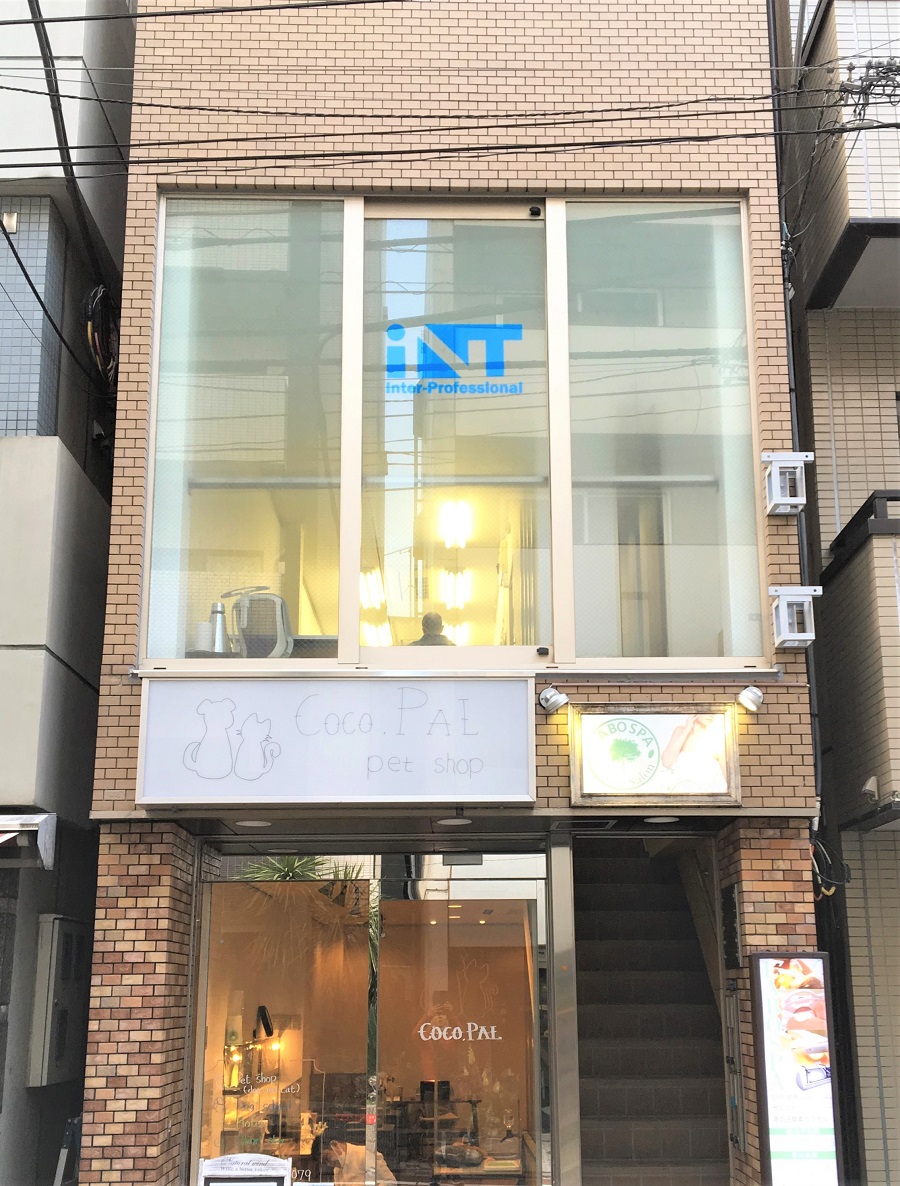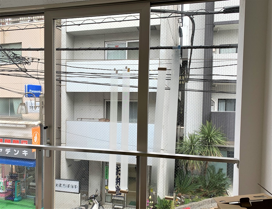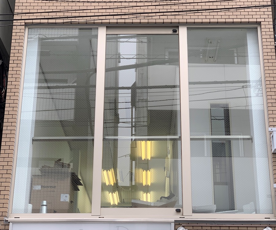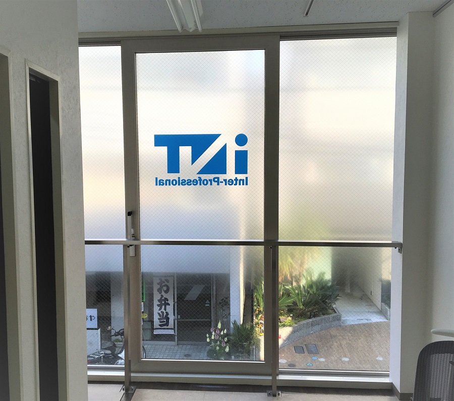 ビル2階、路面側の窓部に目隠しフィルムおよび、カッティングシートでロゴマークを貼付。