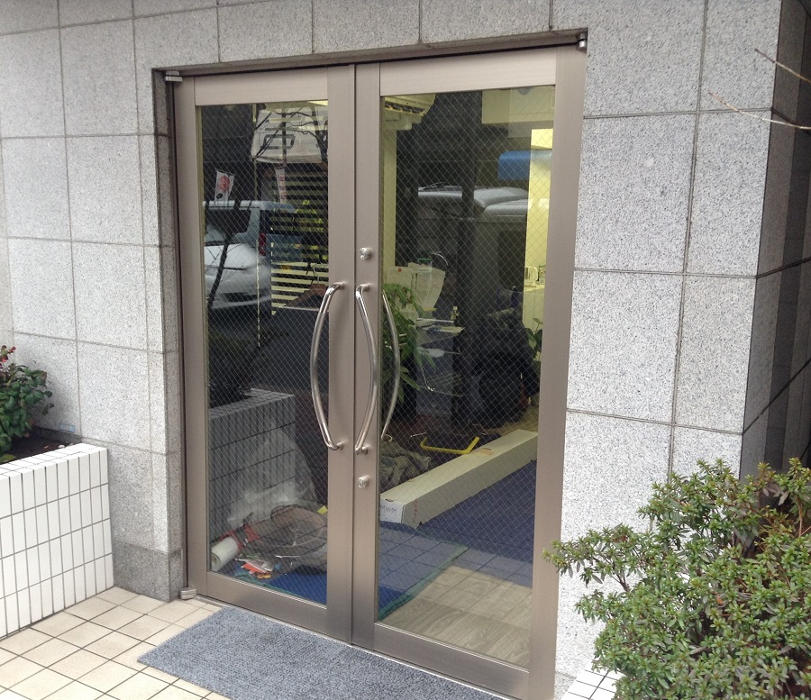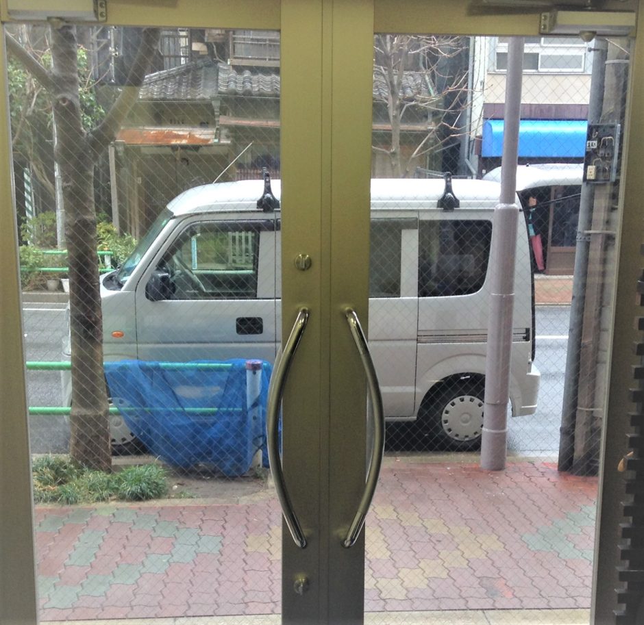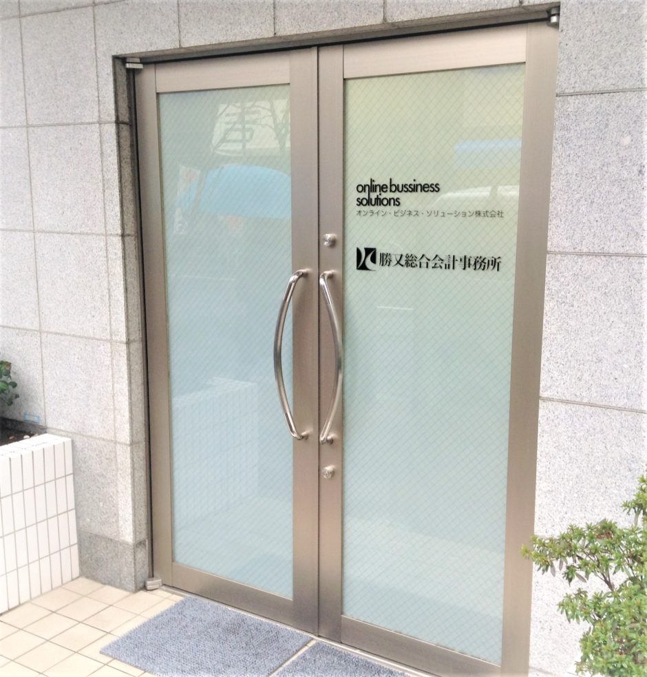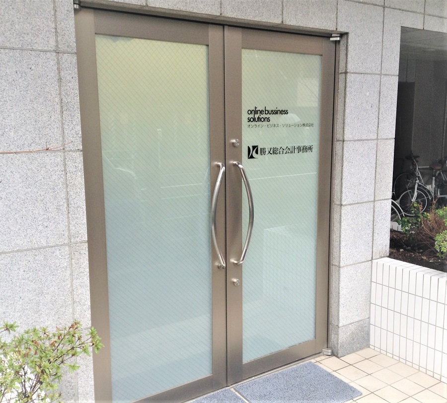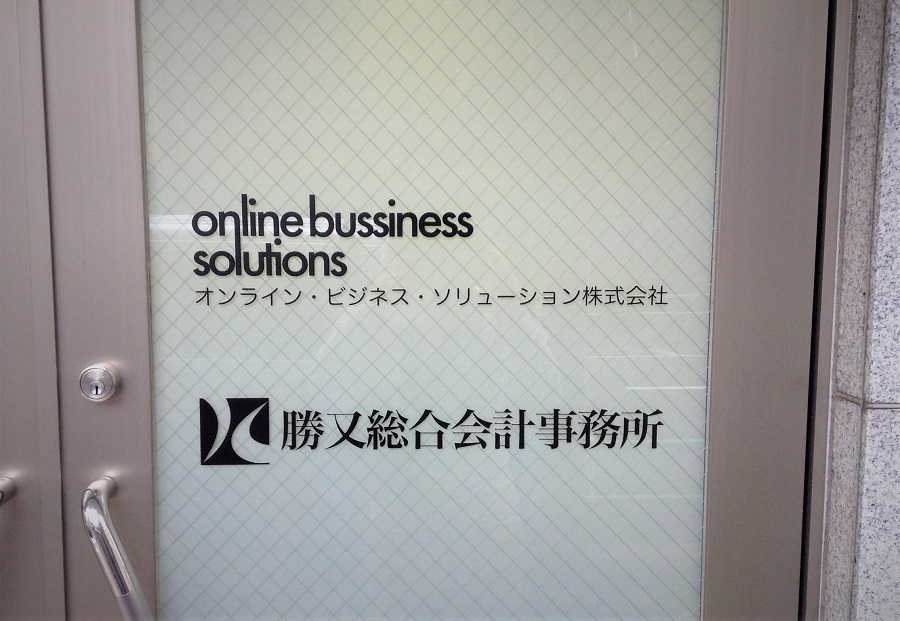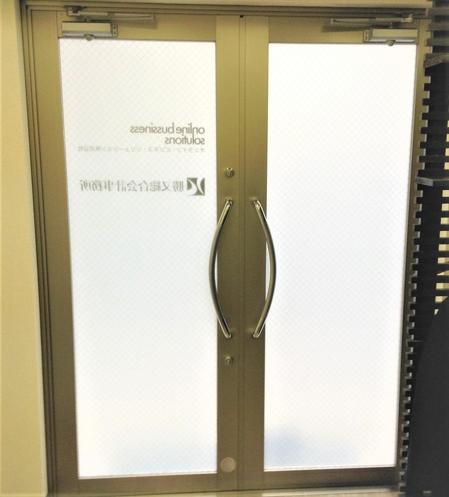 ‍事務所入り口扉窓に目隠しフィルムおよび社名のカッティングシートを貼り付け。