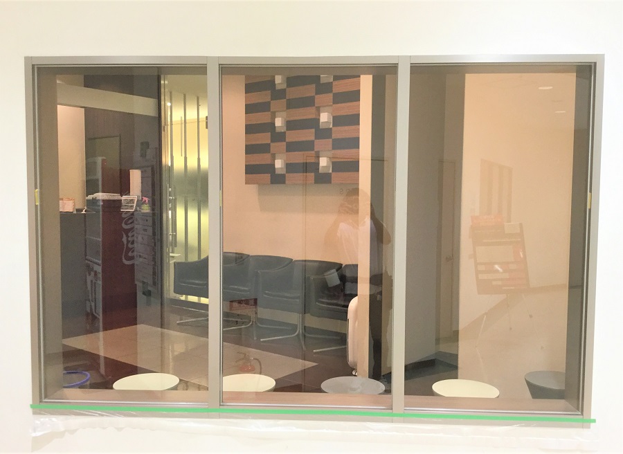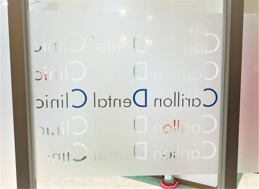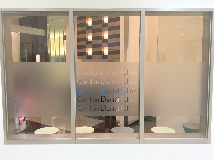 ‍クリニック待合の窓にスリガラス調のフィルムに切り文字を入れて。